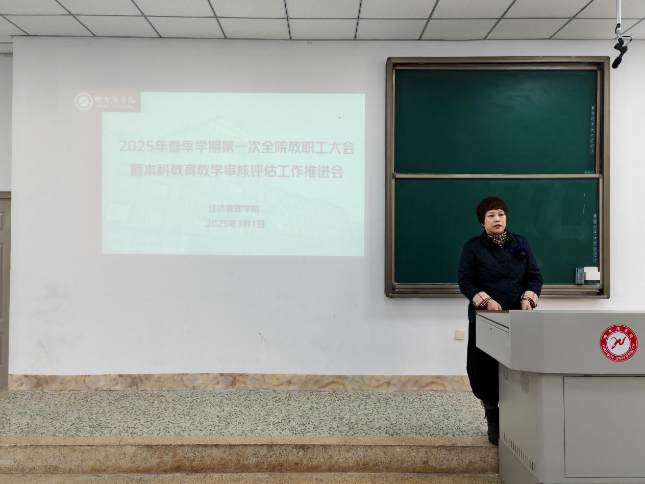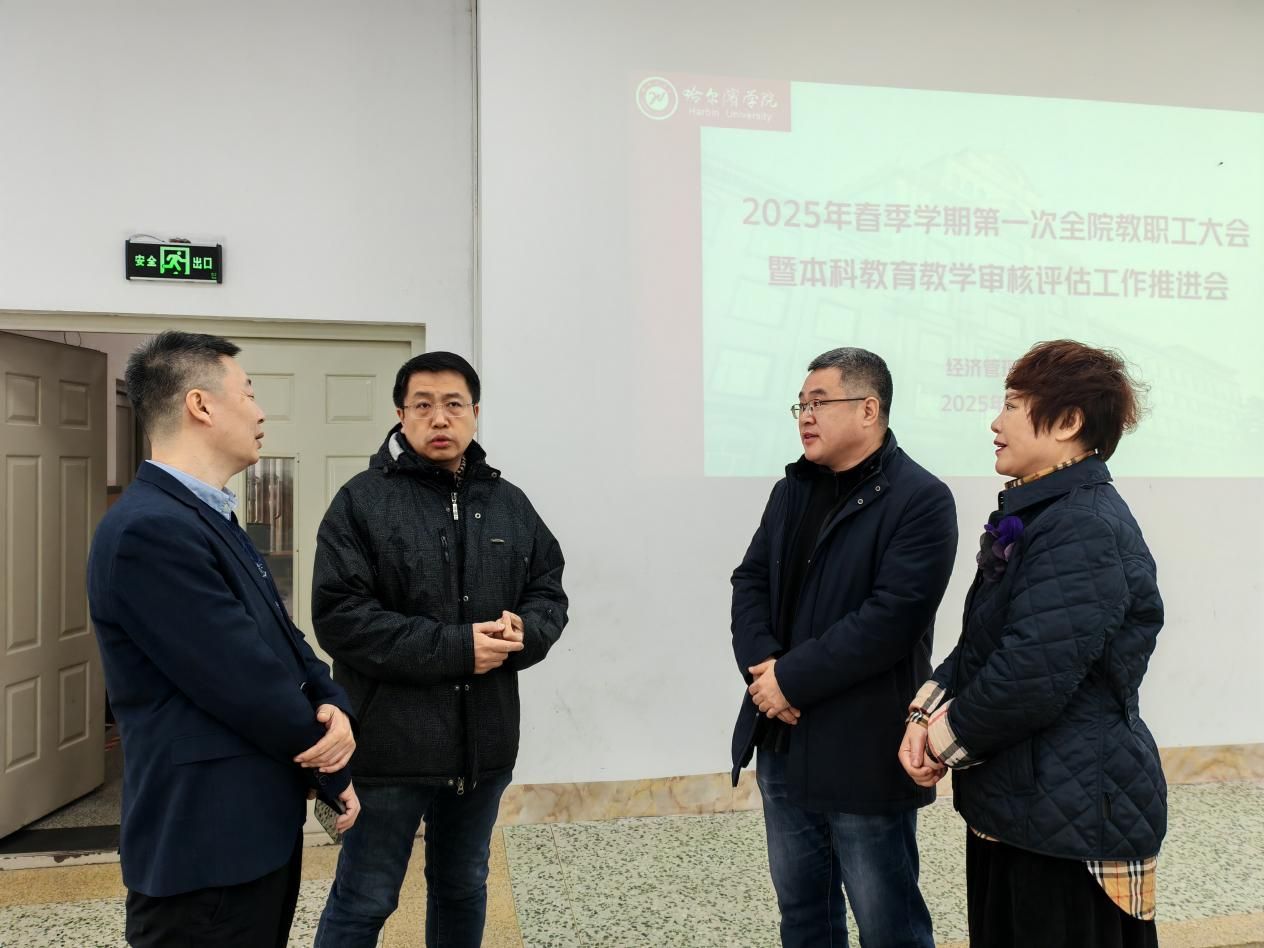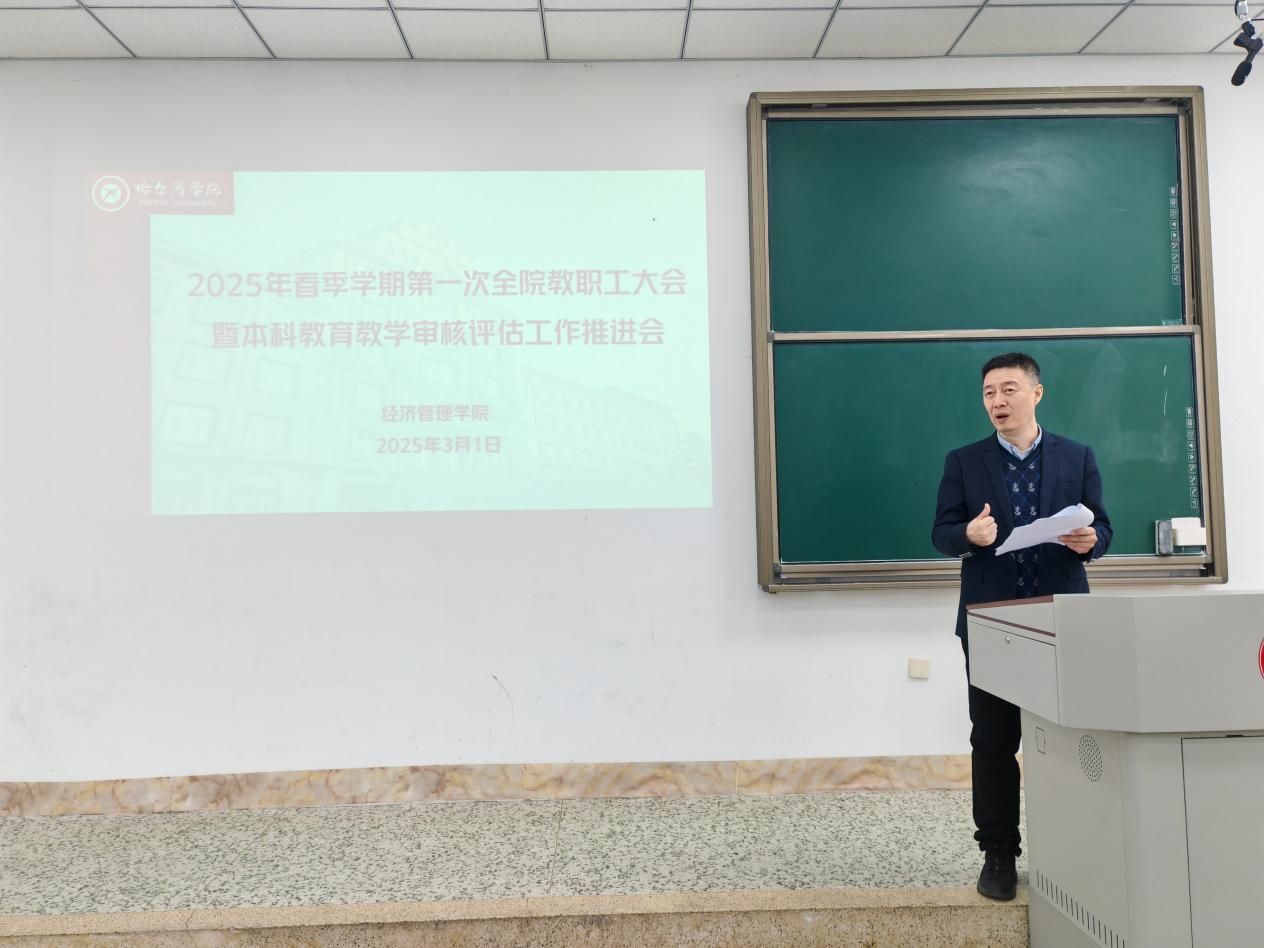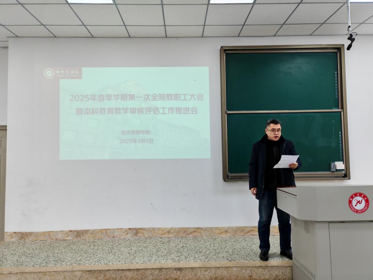 (文/赵浏洋)为全面贯彻落实学校2025年工作会议精神,部署学院重点任务,推进学院审核评估工作,乘着哈尔滨学院第六届教职工代表大会第一次全体会议的东风,3月1日上午,经济管理学院于8102教室召开2025年春季学期第一次全院教职工大会暨本科教育教学审核评估工作推进会,吴旭峰副校长出席会议并讲话,学院领导班子和全体教职工参会,会议由经济管理学院党委书记孙亮主持。