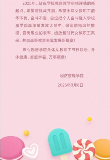 不仅如此,学院还撰写了《最美人间三月天,春花烂漫展新颜——致学院女教职工的一封信》,并号召全体同学节日期间向坚守在课堂一线的女教师们致以节日的问候,传承经管学院尊师重教文化,共同营造温馨和谐的校园氛围。