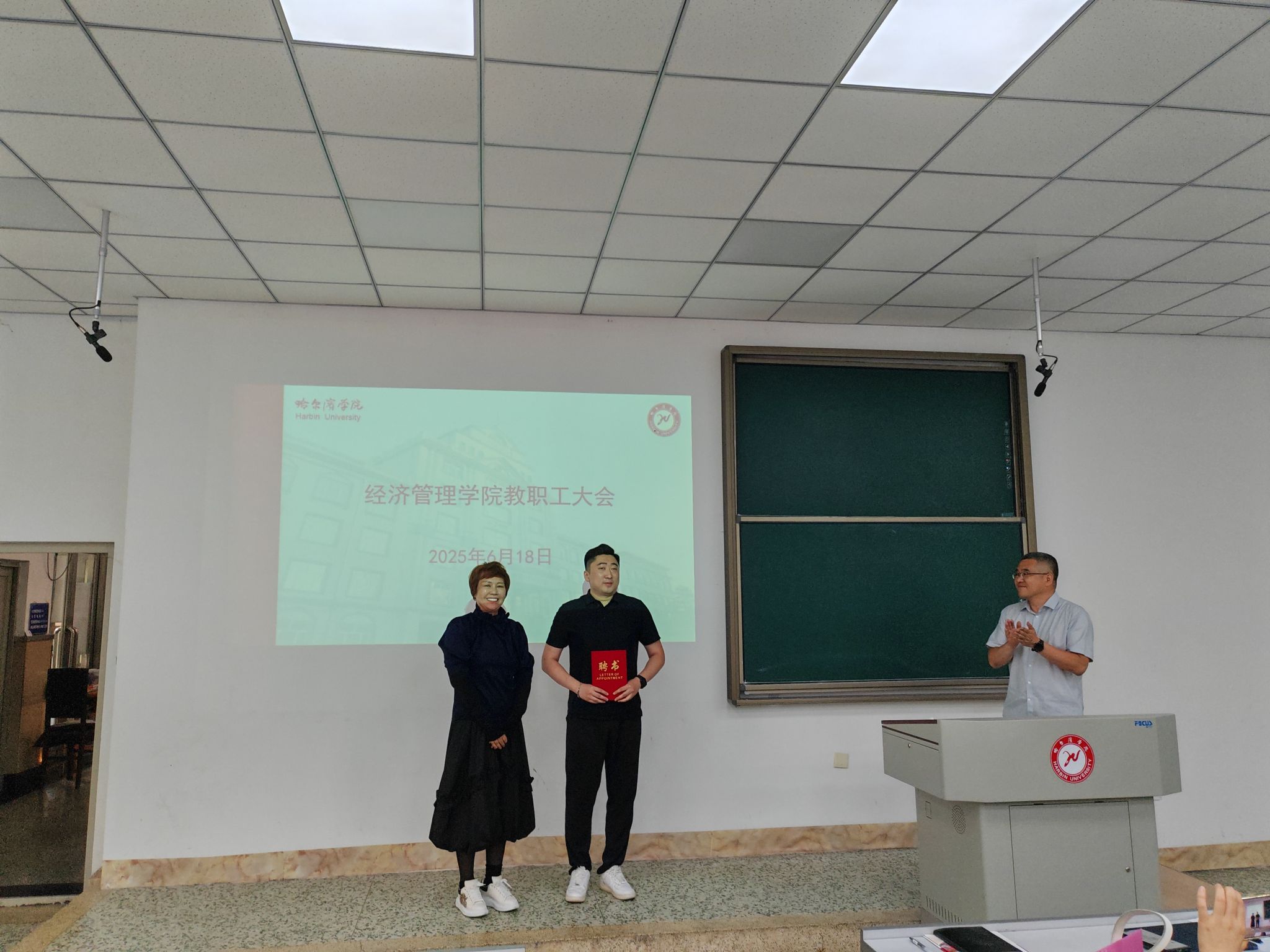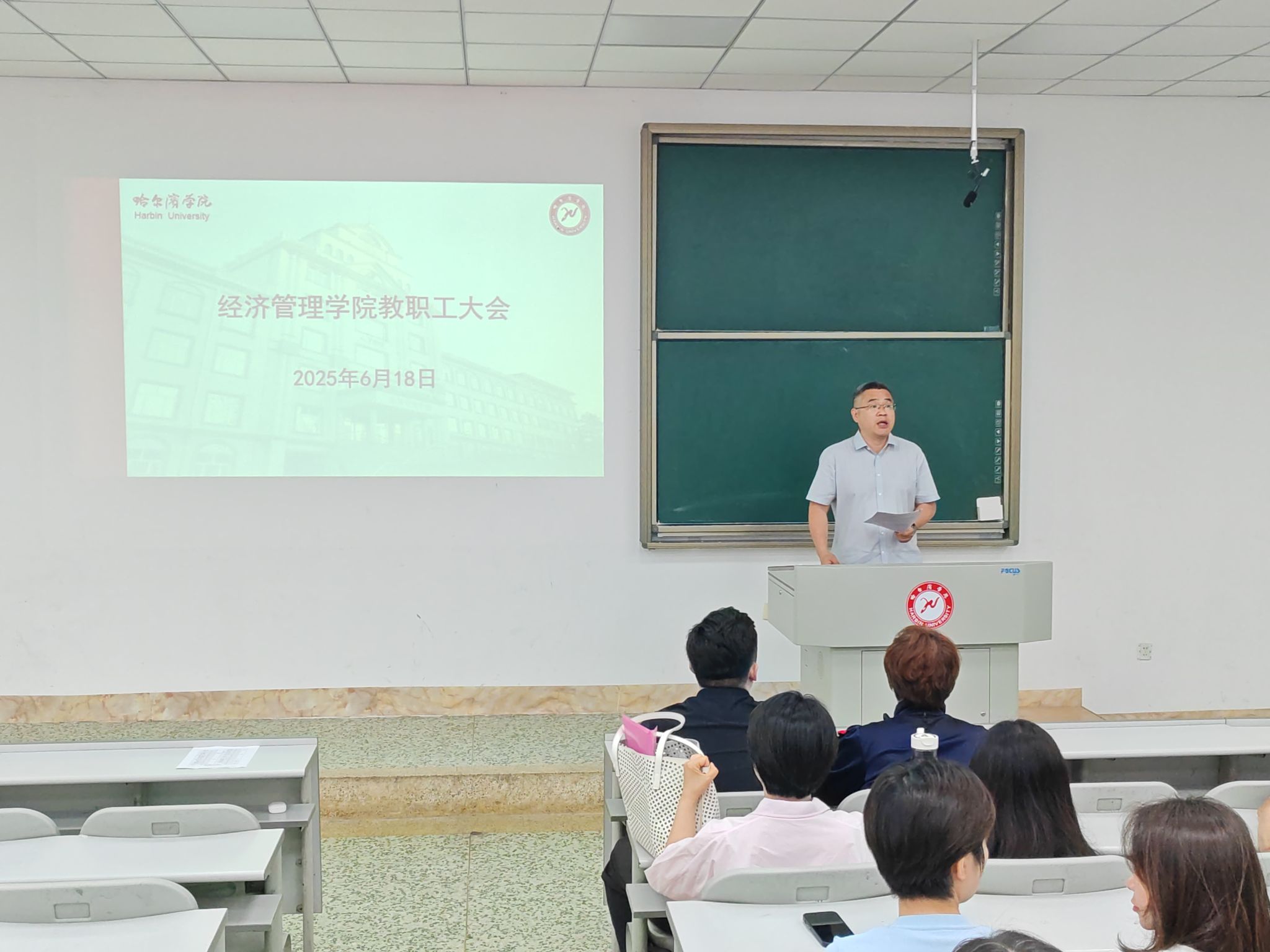 高子清院长首先传达了学校近期下发的多个重要文件,详细解读了《哈尔滨学院教师中高级专业技术职务任职资格评价标准(修订)》,对比了修订前后的主要区别,为教师申报职称进行了辅导。在解读《哈尔滨学院教师校外兼职管理办法》时,她强调,上周孙钊书记参加我院承办的丁香大讲堂时指出,以我院为试点,开展教师校外兼职管理工作,我院教师开展校外兼职活动必须在完成学校规定的教学、科研、管理服务等工作的前提下进行。她还传达了省教育厅6月4日《关于向哈尔滨学院反馈专家组审核评估报告的通知》,对学院评估整改工作、申硕工作和就业工作情况进行了通报,对下一步工作作了部署。