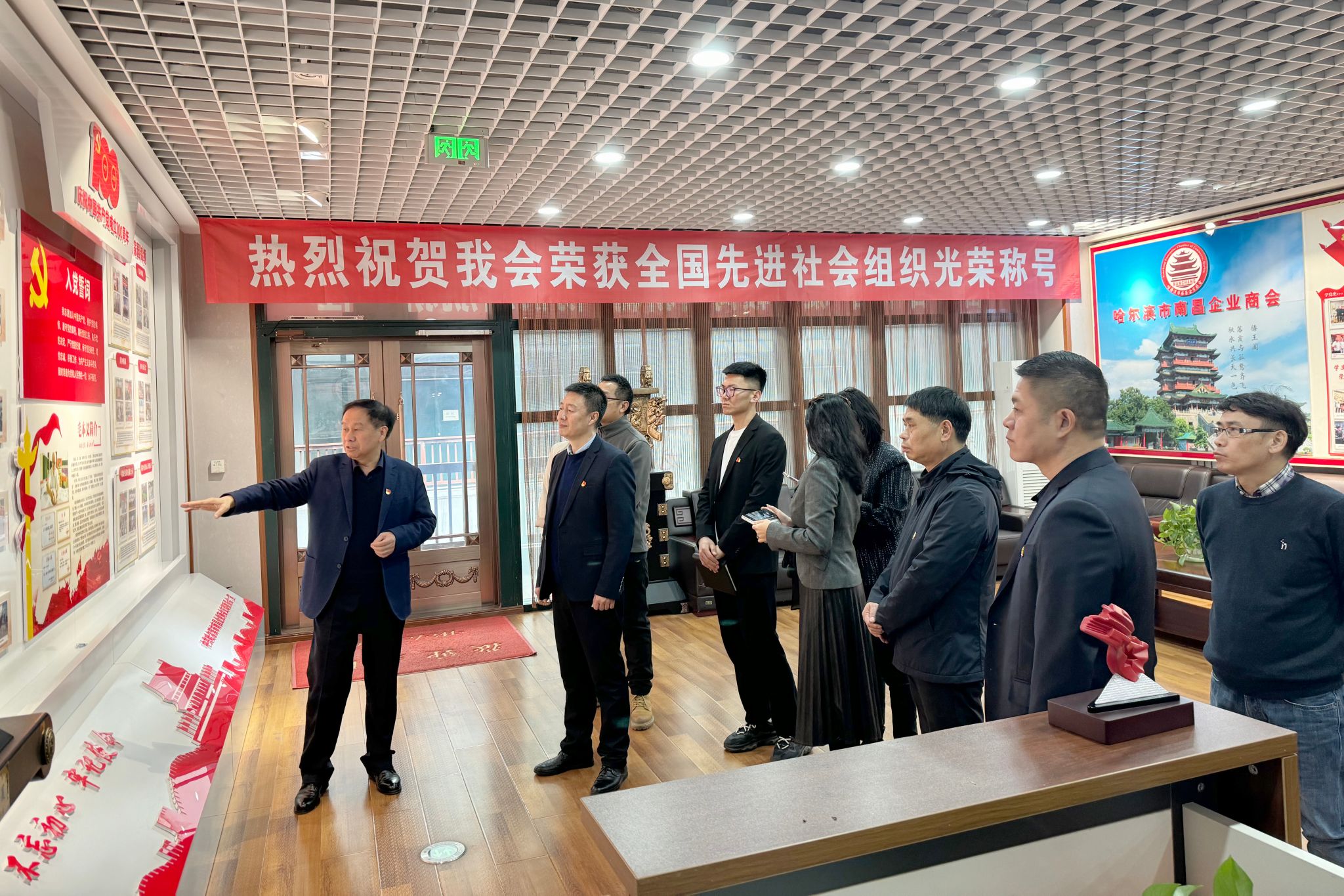11月21日,孙亮一行到哈尔滨市南昌企业商会开展党建共建交流活动,会长胡建秀、执行会长黄志坚、监事长朱水华、理事长马宏伟、秘书长徐佰华等代表热情接待。