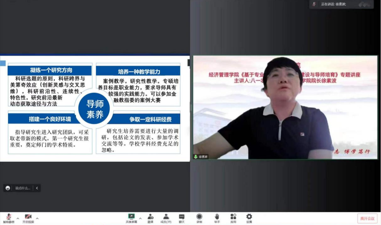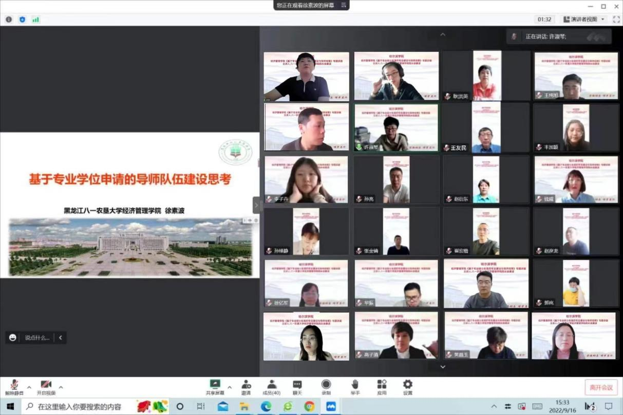 (文/尚丹)按照哈院发【2022】1号文件关于印发《哈尔滨学院2022年工作要点》的通知精神,把握应用型的办学定位,提高办学层次,加强学院在学科专业建设上的内涵式发展。2022年9月16日下午,经济管理学院通过腾讯会议召开了本次全院范围的主题教研活动。活动由经济管理学院副院长高子清教授主持,黑龙江八一农垦大学经济管理学院院长、管理学博士徐素波教授作了题为《基于专业学位申请的导师队伍建设思考》的报告。