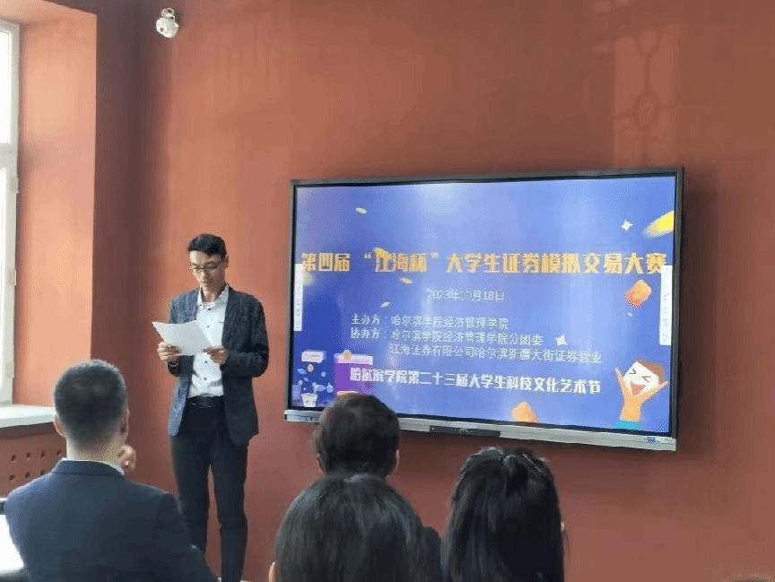(文/高晶)在学校全面开展学风建设工作,同时也是第二十三届大学生科技文化艺术节之时,为促进大学生以知致行,增强创新实践能力,提升同学们在股票市场中的投资智慧,10月18日下午,由经济管理学院主办,经济管理学院分团委、江海证券有限公司哈尔滨新疆大街证券分营部协办的第四届“江海杯”大学生证券模拟交易大赛开幕式在七号楼一楼会议室顺利召开。经济管理学院党委书记孙亮、院长许淑琴、正处级辅导员沙迪、副院长高子清、副院长程宇、指导教师刘雪峰、学工办主任高晶、辅导员李想参会。