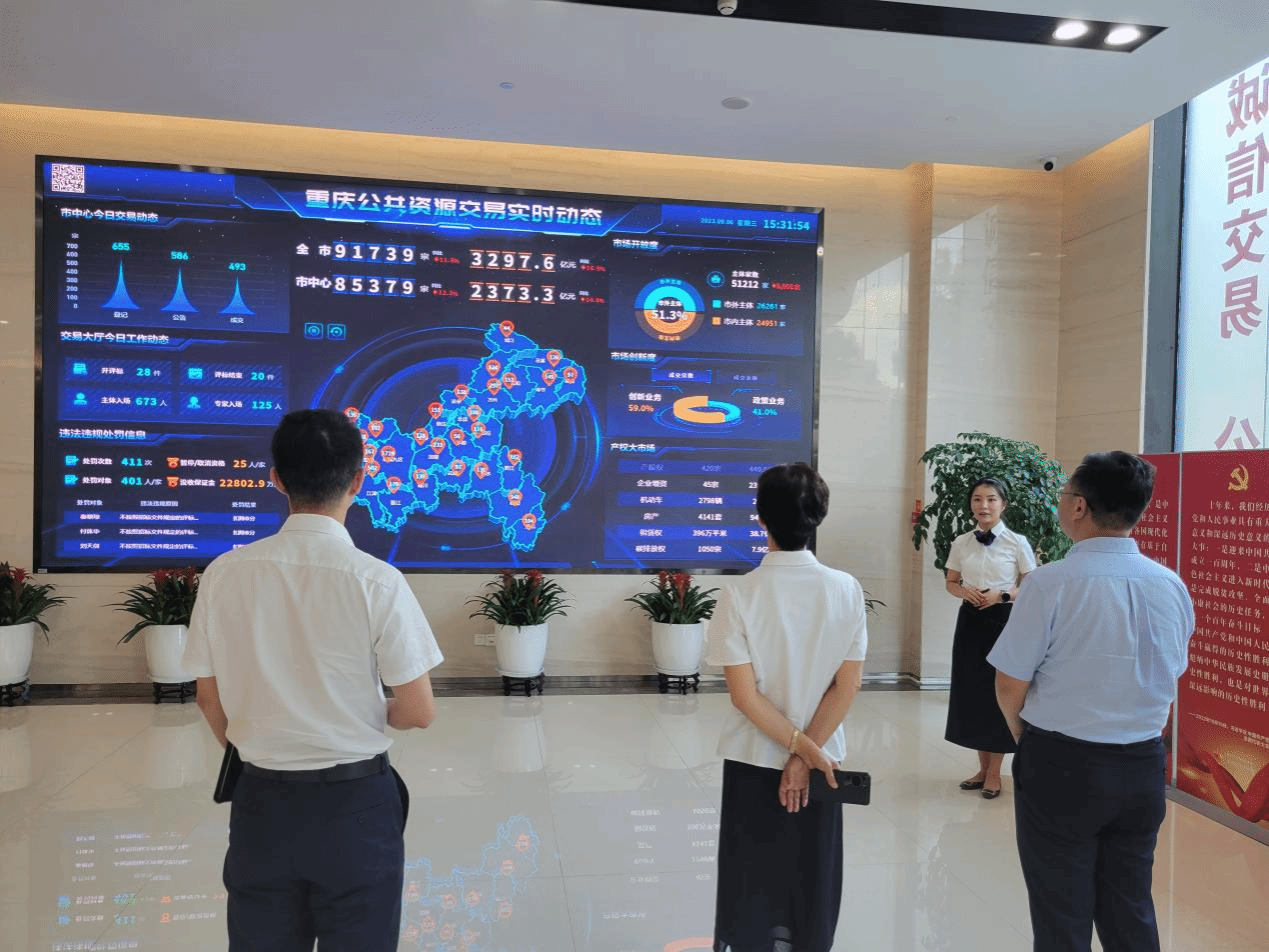 随后,调研组赴重庆环境资源交易所调研,负责碳排放权交易业务的经理及相关职能部门负责人接待并陪同。在讲解员的带领下,了解交易所的发展历程、业务范围及重庆公共资源交易的实时动态等情况,并参观了交易服务大厅、专家通道、开评标区、监控区等标准化、智能化、数字化交易场所,现场了解了场地智能化综合管控平台、公共资源交易大数据平台的功能与应用。会议交流过程中,交易所负责人分别从当前碳排放权注册登记情况、碳交易市场运行情况以及国际碳交易市场运行情况展开了介绍。双方对当前“碳中和、碳达峰”目标下,碳排放权交易市场建设、管理问题展开了交流和讨论,详细了解碳交易市场和企业碳管理的人才需求。就联合上海环境能源交易所、重庆环境能源交易所、哈尔滨产权交易所等单位建设“绿色经济产业学院”事宜进行沟通。
