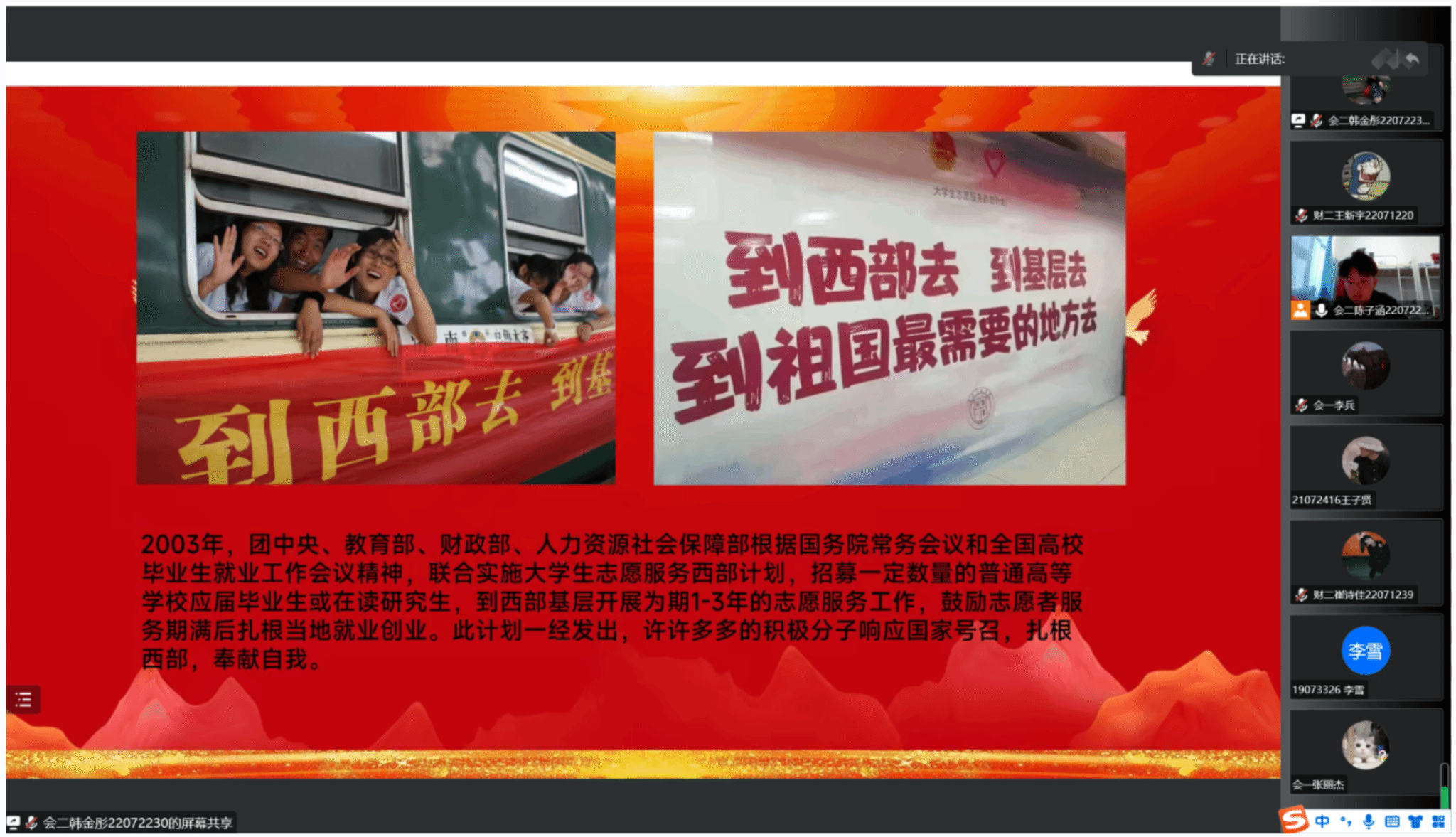 (文/高晶)为贯彻落实党的二十大精神,深入学习贯彻习近平新时代中国特色社会主义思想,引导青年学子扎根基层沃土,厚植爱党爱国情怀,鼓励我院学生到祖国最需要的地方去。5月8日,经济管理学院分团委通过线上腾讯会议的形式开展了“志愿西部行 奉献新时代”主题团会活动。本次会议由陈子涵同学主持,共120名青年代表参加会议。