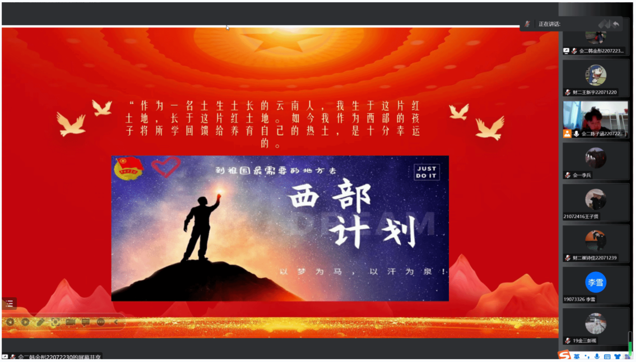 本次宣讲会共有观看宣传片、西部计划项目介绍与政策宣讲、分享志愿者故事、互动答疑四个环节。宣传片展现了一批又一批西部计划志愿者从祖国四面八方赶来,前仆后继、赓续奋斗的画面,谱写了一首首“青年立志在四方”的青春之歌。通过介绍西部计划的报名程序以及服务内容,为青年学子答疑解惑,使他们对什么是西部计划有了更深刻的认识和理解;通过讲述志愿者服务基层的故事呼吁青年投身到西部,为西部的发展做更大的贡献,鼓励青年发扬“特别能吃苦、特别能战斗、特别能忍耐、特别能团结、特别能奉献”的精神。