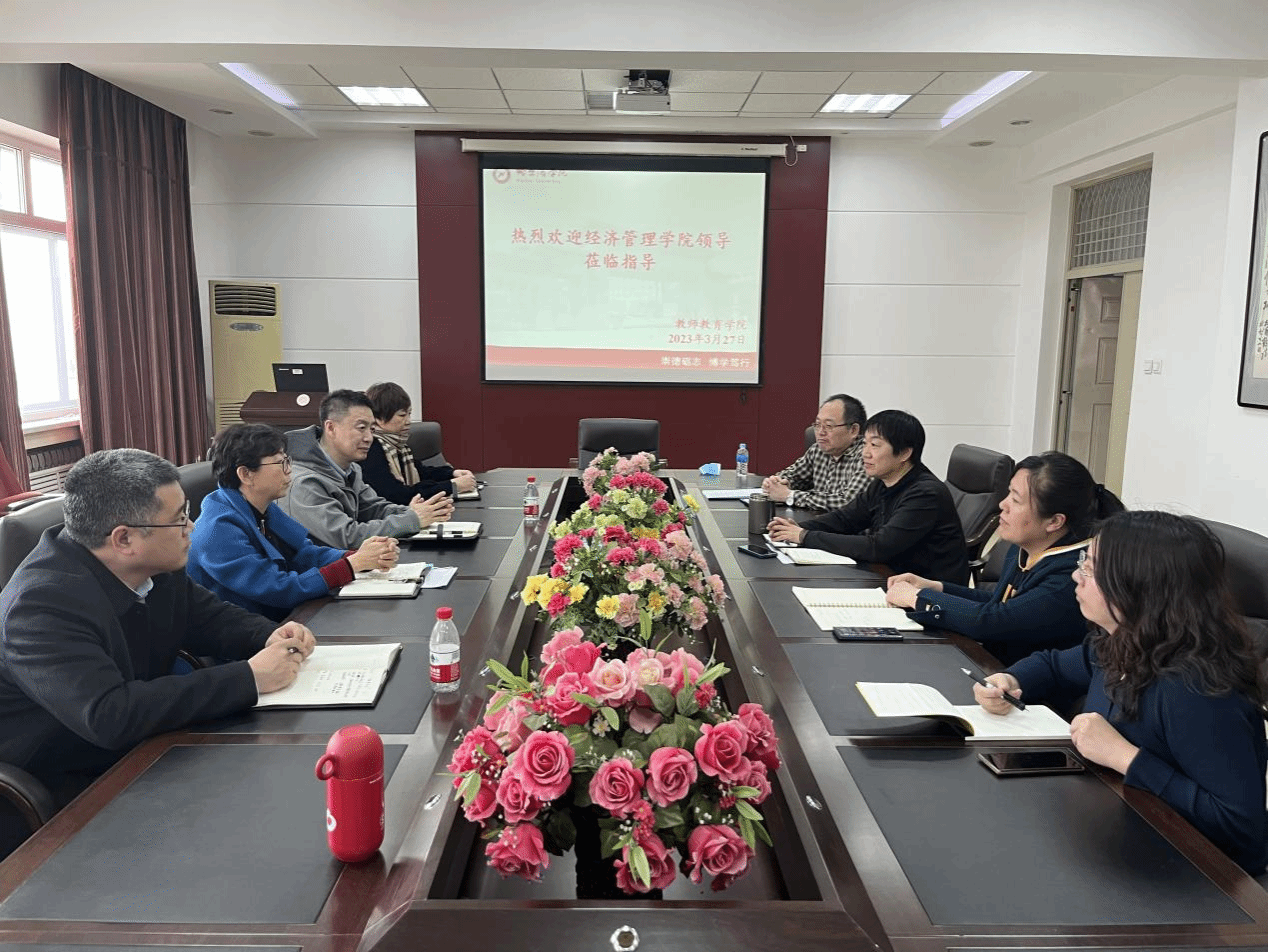 为贯彻落实习近平总书记关于加强高校毕业生就业工作的重要指示精神,学习借鉴兄弟院系在毕业生就业工作方面的先进做法和宝贵经验,结合学院工作实际,推动学院整体就业率稳步提高,2023年3月27日下午,经济管理学院院长许淑琴、书记孙亮、副院长高子清、正处级辅导员沙迪、学工办主任高晶一行五人到教师教育学院学习交流,教师教育学院院长周淑红、书记杨晓静、副院长刘亨荣、副处级辅导员孙华热情接待。