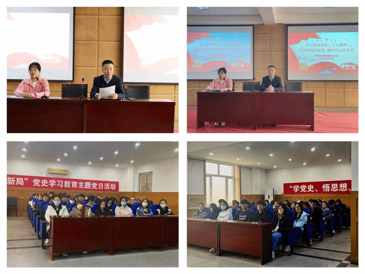 3月22日下午,经济管理学院党委书记孙亮以“学习贯彻党的二十大精神 踔厉奋发启征程 满怀信心向未来”为题,在7603为学院百余名学生党员、学生干部和班级学生代表讲授2023年春季学期“开学第一课”。会议由经济管理学院党委委员、学工办主任高晶主持。