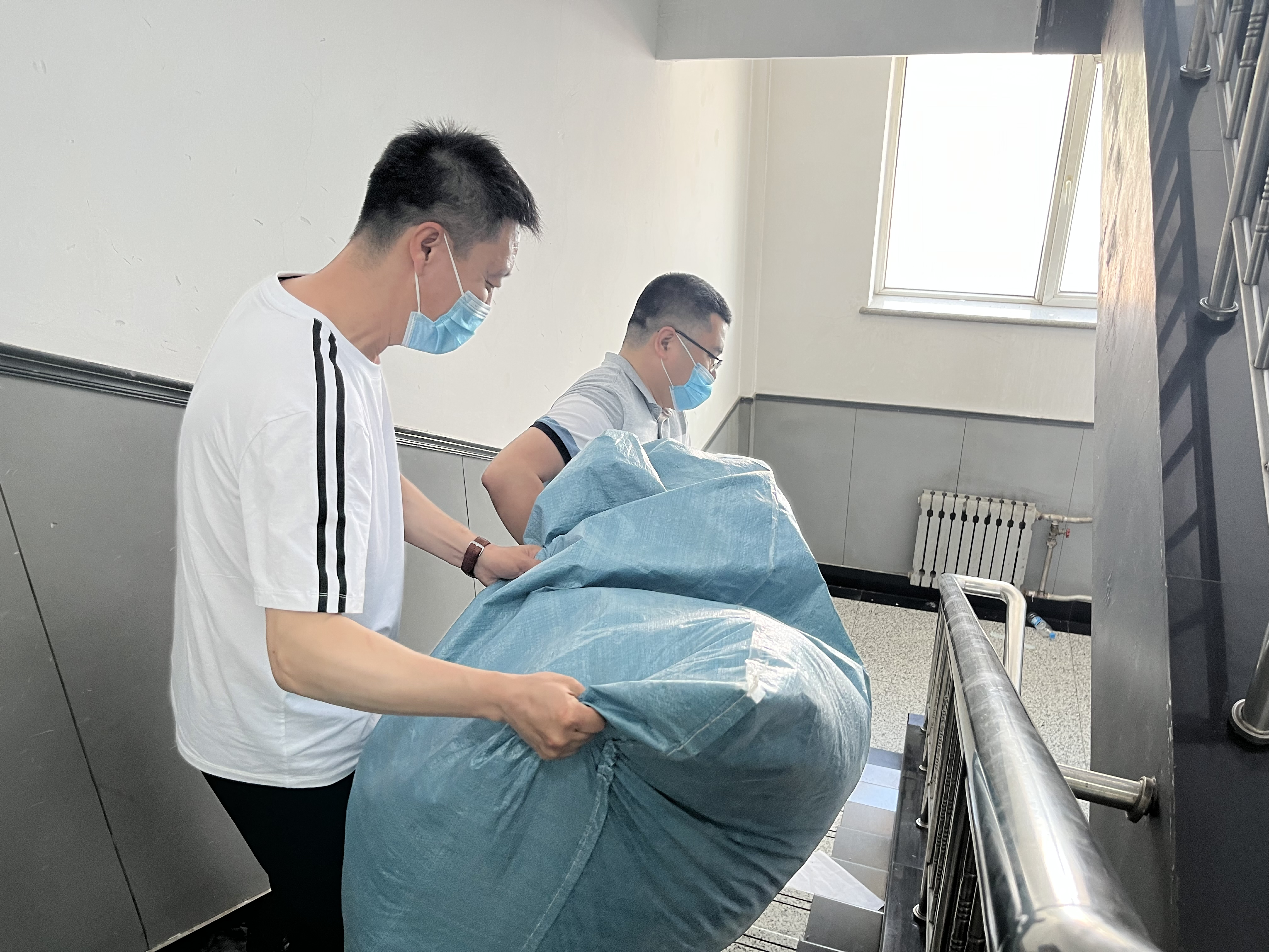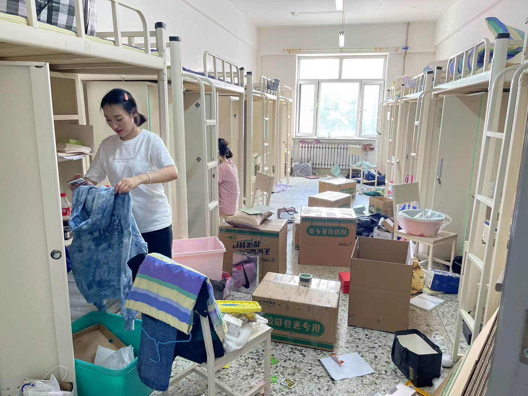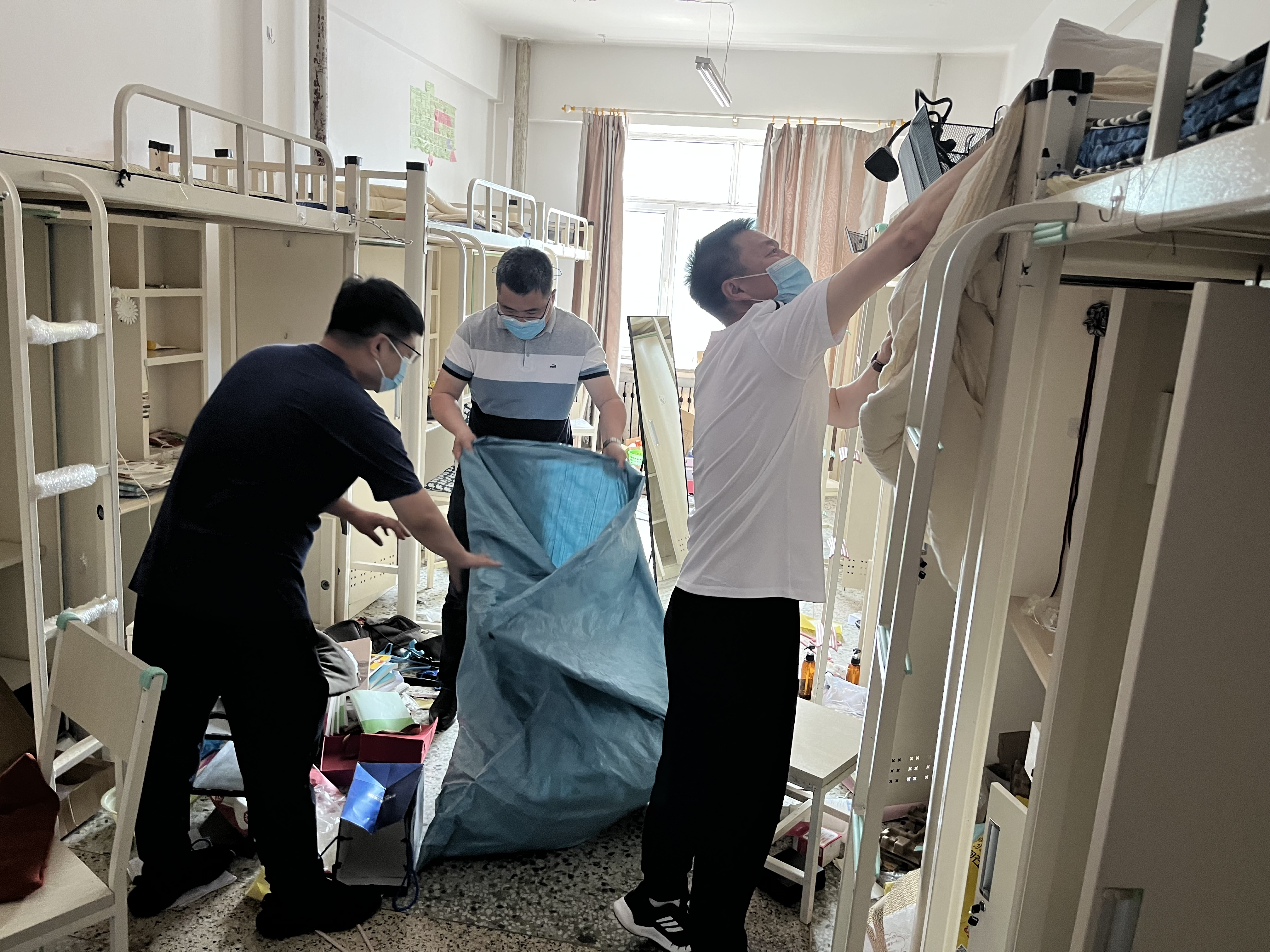 辅导员们全天坚守在寝室和行李邮寄点,大到十几斤的电脑,小到证明材料,辅导员们都耐心细致地帮助学生整理和邮寄,甚至忙碌到忘记午饭。由于天气闷热加上长时间高强度持续工作,有的辅导员出现了低血糖等身体不适;有的辅导员前几日刚扭伤胳膊,但依旧早早地赶到学校,加入打包行李的行列。他们把对学生的关爱和祝福装进行囊,用行动诠释“爱与责任”的师德内涵,为学生上好“最后一堂思政课”。