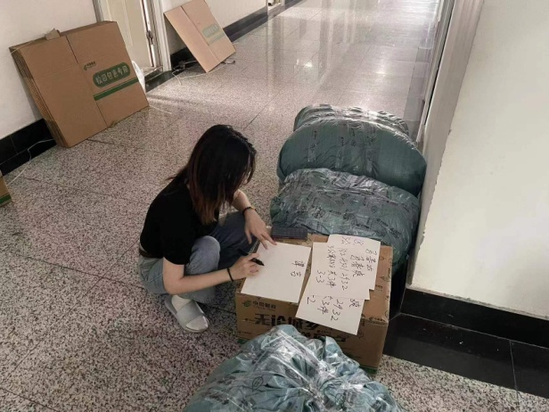 参与打包的志愿者们通过视频、电话、直播等方式与毕业生取得联系,确定物品归属,进行反复核对、确认后封箱、填写学生信息,确保每位毕业生的物品准确打包。打包过程中,很多志愿者的衣服早早被汗水浸透,手指被打包胶带勒出了深深的痕迹。志愿者为同学们寄出的不但是大学四年满满的青春记忆,更是在特殊时期同窗间一份浓浓的情谊。