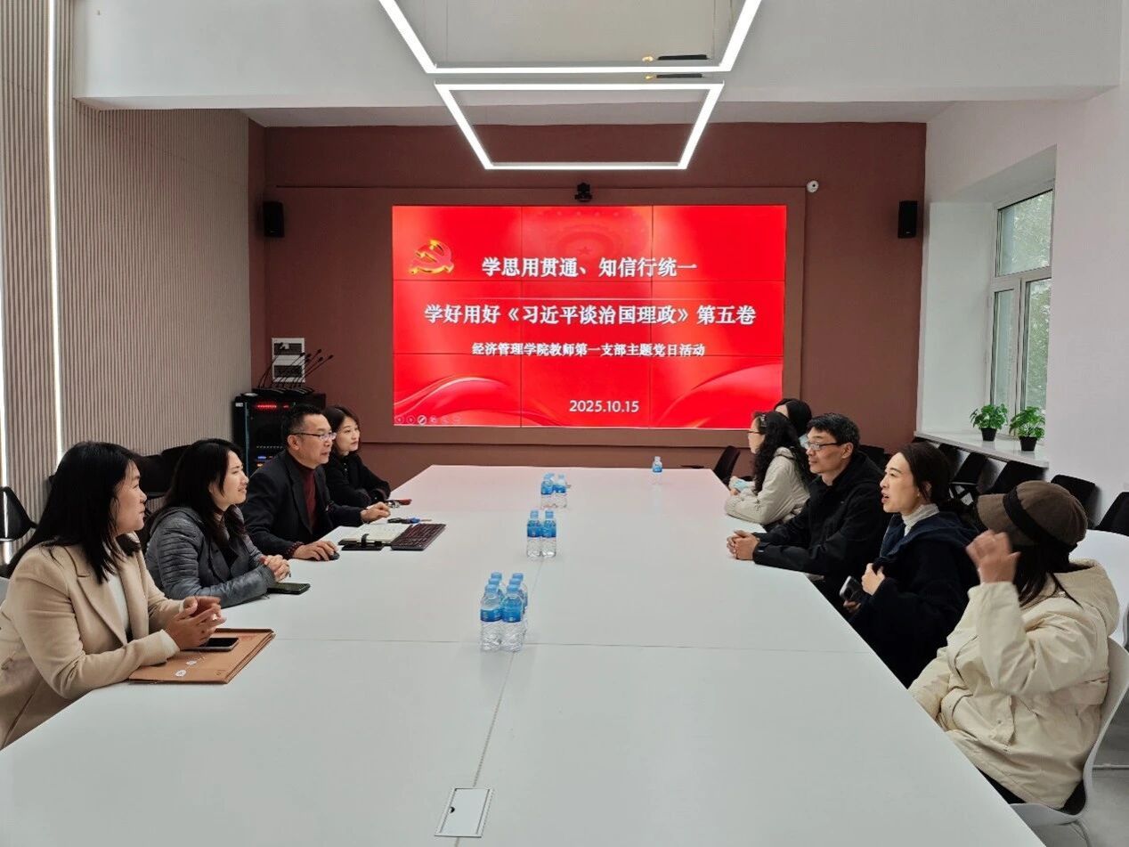 (文/高晶)为深入学习贯彻习近平新时代中国特色社会主义思想,结合学校党委10月份党建工作要点,经济管理学院教师第一党支部于2025年10月15日下午组织召开了以 “学思用贯通,知信行统一,学好用好《习近平谈治国理政》第五卷” 为主题的主题党日活动。本次活动由支部书记赵彦龙主持,全体教师党员参加。