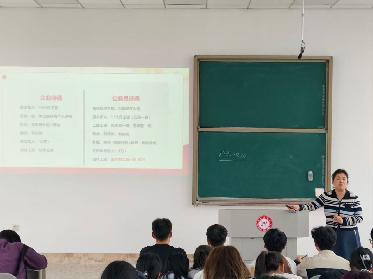 讲座伊始,安心老师从考公、考研、就业三个方面入手,通过详实的数据和生动的案例分析,让同学们清晰地了解到各行业的就业现状与发展趋势。随后,她对公务员考试形式展开全面剖析,帮助同学们建立清晰认知。围绕岗位选择给出核心建议,强调需综合多重因素以提升上岸概率并契合个人发展。