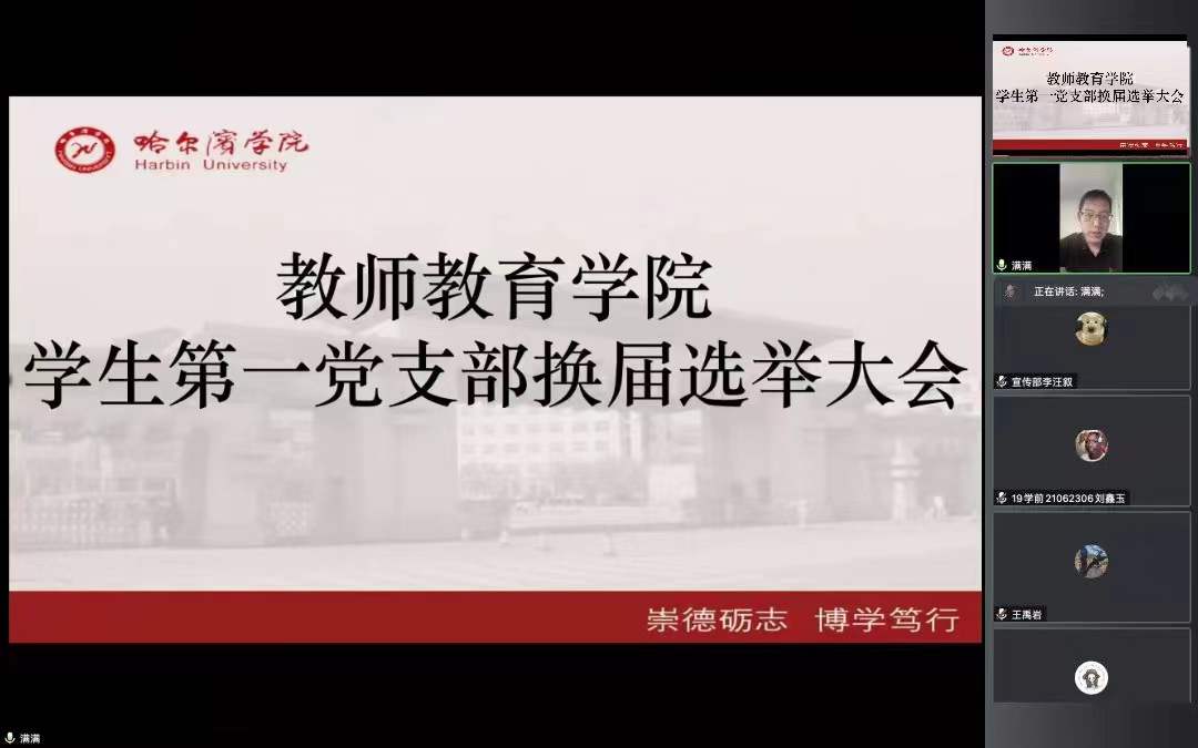 为落实党内民主制度,保障广大党员民主权利,按照校党委组织部及院党委的统一部署和要求,教师教育学院学生第一、第二党支部分别于5月27日、28日召开线上换届选举大会。出席换届大会的有院党委书记杨晓静、党委委员副处级辅导员孙华、学生第一党支部书记张满,学生第二党支部书记李一宁,各支部全体正式党员及预备党员。选举大会分别由学生第一党支部书记张满、学生第二党支部书记李一宁主持。