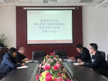 为全面落实省委解放思想,推动高质量发展的要求,更好地开展我院学生工作,使学风建设纵深发展,推动教育科学学院高质量发展。教育科学学院于2019年4月3日11:00在6211会议室举行“解放思想、加强学风建设,做优秀学工干部”思想讨论会。参与本次讨论会的有教育科学学院党总支书记李铁岩、副处级辅导员孙华、学工办主任张满、辅导员李一宁。