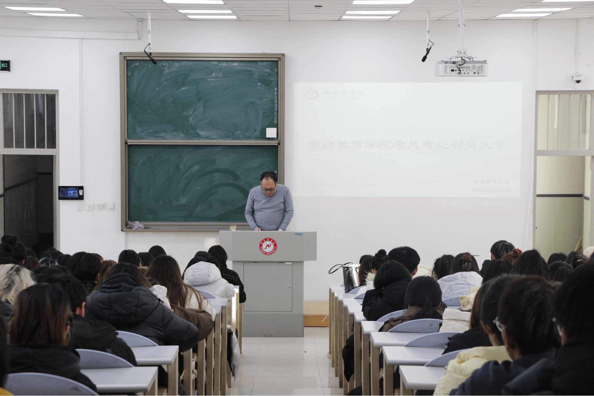 (文/董佳欣)为严格要求考风考纪,发挥“一站式”学生社区在诚信教育中的实际作用,教师教育学院于12月16日12:30在6401教室组织召开考风考纪动员大会,本次大会由教师教育学院副处级辅导员老师孙华主持,各年级辅导员老师出席,21、22、23、24级全体党员、学院及班级学生干部、寝室长参加。