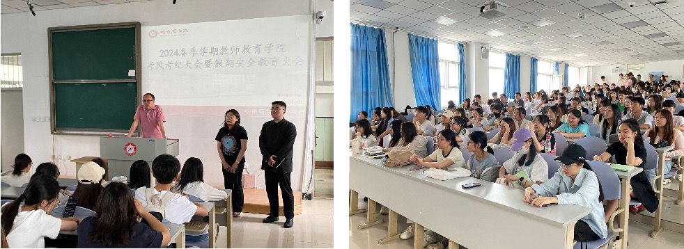 为端正考试风气、严肃考试纪律,进一步加强诚信学风建设, 营造一个公正有序的考试环境。教师教育学院于6月20日在6501教室召开考风考纪大会暨假期教育安全大会。本次大会由副处级辅导员老师孙华主持,22级学生辅导员老师李博宇和21级学生辅导员老师董佳欣出席,21、22、23级全体学生参加。