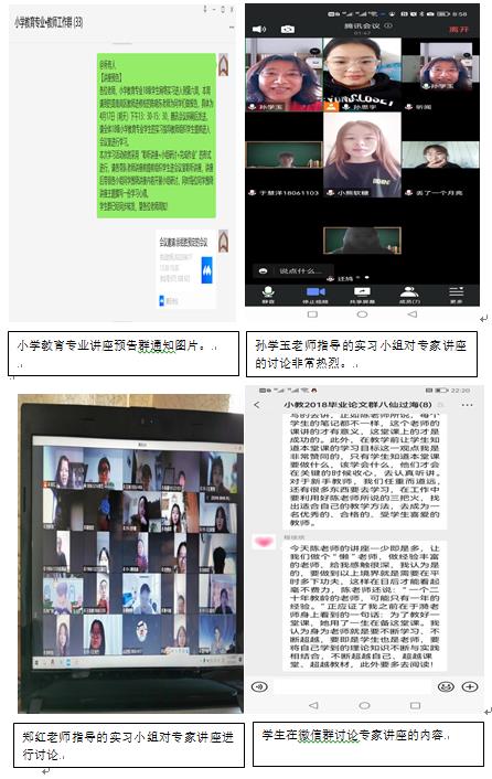 学院两个专业分别设计了丰富多彩的线上活动,将小学和幼儿园的课堂引入云端,邀请基础教育名家经验分享,让在四面八方的学生在家里也能参与进来。而且由于云上实习打破了原来学生只能参加一个实习点的限制,学生们可以看到不同学校或幼儿园优秀的教学和管理,大家在云平台上尽情讨论交流,反而达到了常规线下实习没有的效果。正可谓:实习虽上线,质量不下线。云端做老师,现实长技能。