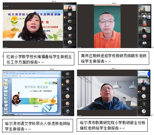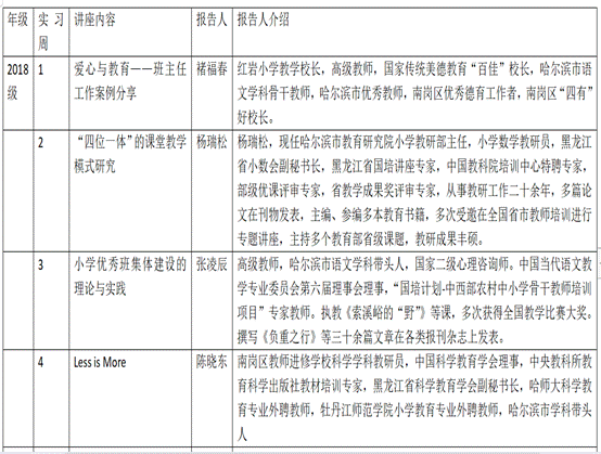 根据小学教育专业2018级教育实习工作方案的要求,小学教育专业教育实习采用“网络学习”、“小组研讨”、“作业训练”相结合的活动形式开展。平均每周至少开展一次的网络学习和研讨工作。讲座的主体围绕小学教师的教学工作和班主任工作精心设计,满足教学活动目的的需要。具体而言,在教育实习工作过程中,通过邀请一线知名专家讲座和观看网络教育学习资源等多种形式开展网络学习活动。具体安排见下表:
