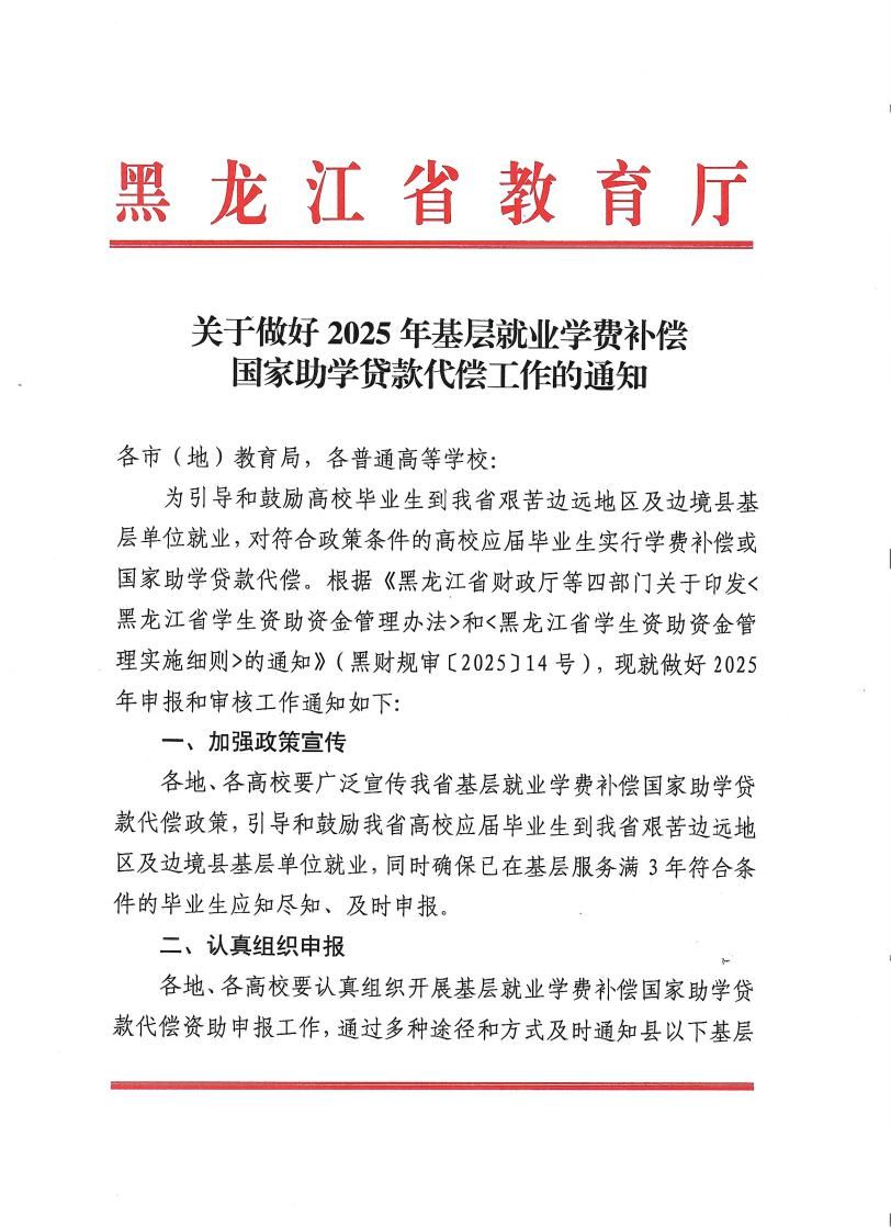为引导和鼓励高校毕业生到我省艰苦边远地区及边境县基层单位就业,对符合政策条件的高校应届毕业生实行学费补偿或国家助学贷款代偿,根据《黑龙江省财政厅等四部门关于印发〈黑龙江省学生资助资金管理办法〉和〈黑龙江省学生资助资金管理实施细则〉的通知,(黑财归审〔2025〕14号),现就做好2025年申报和核查工作通知如下: