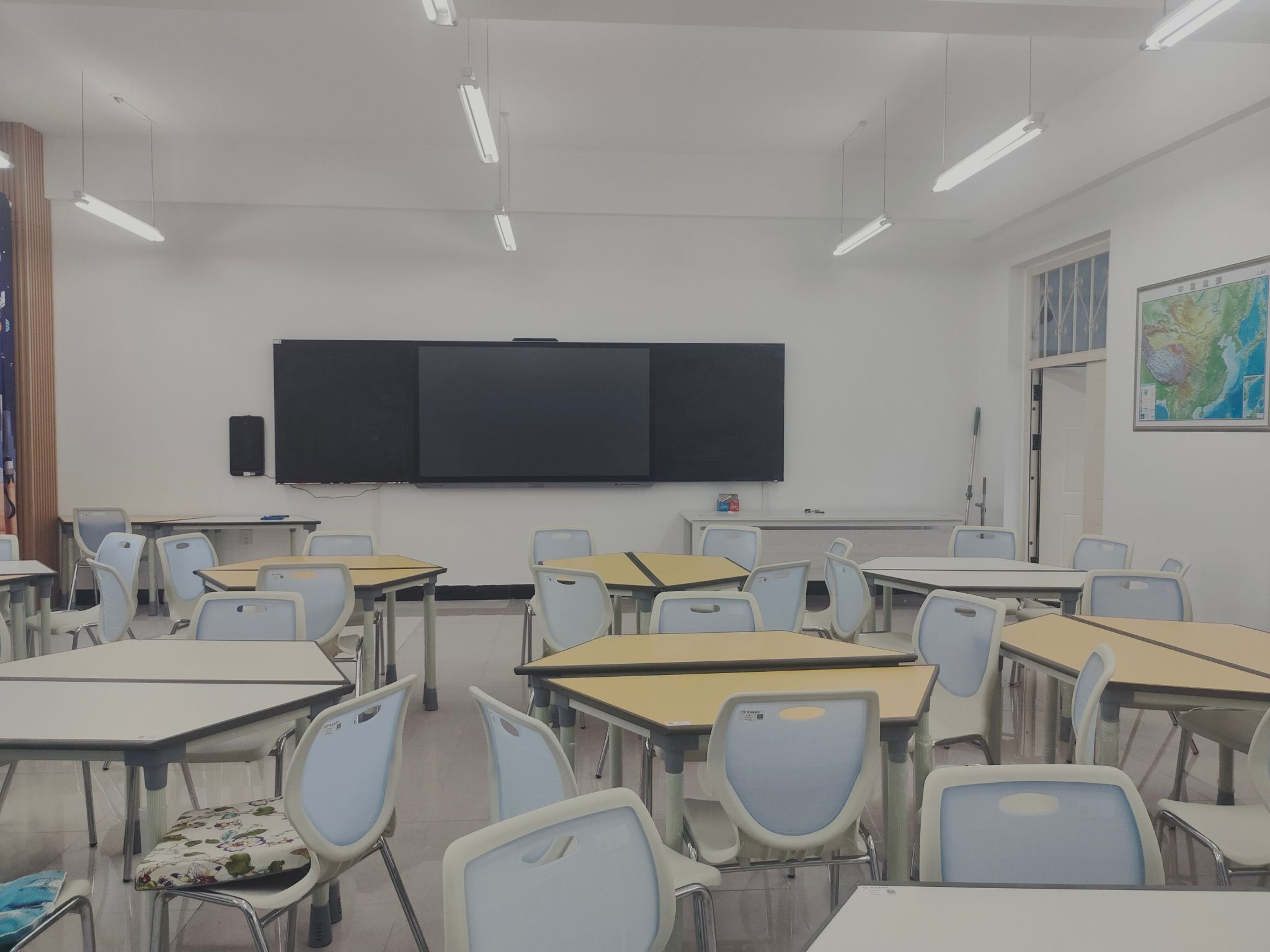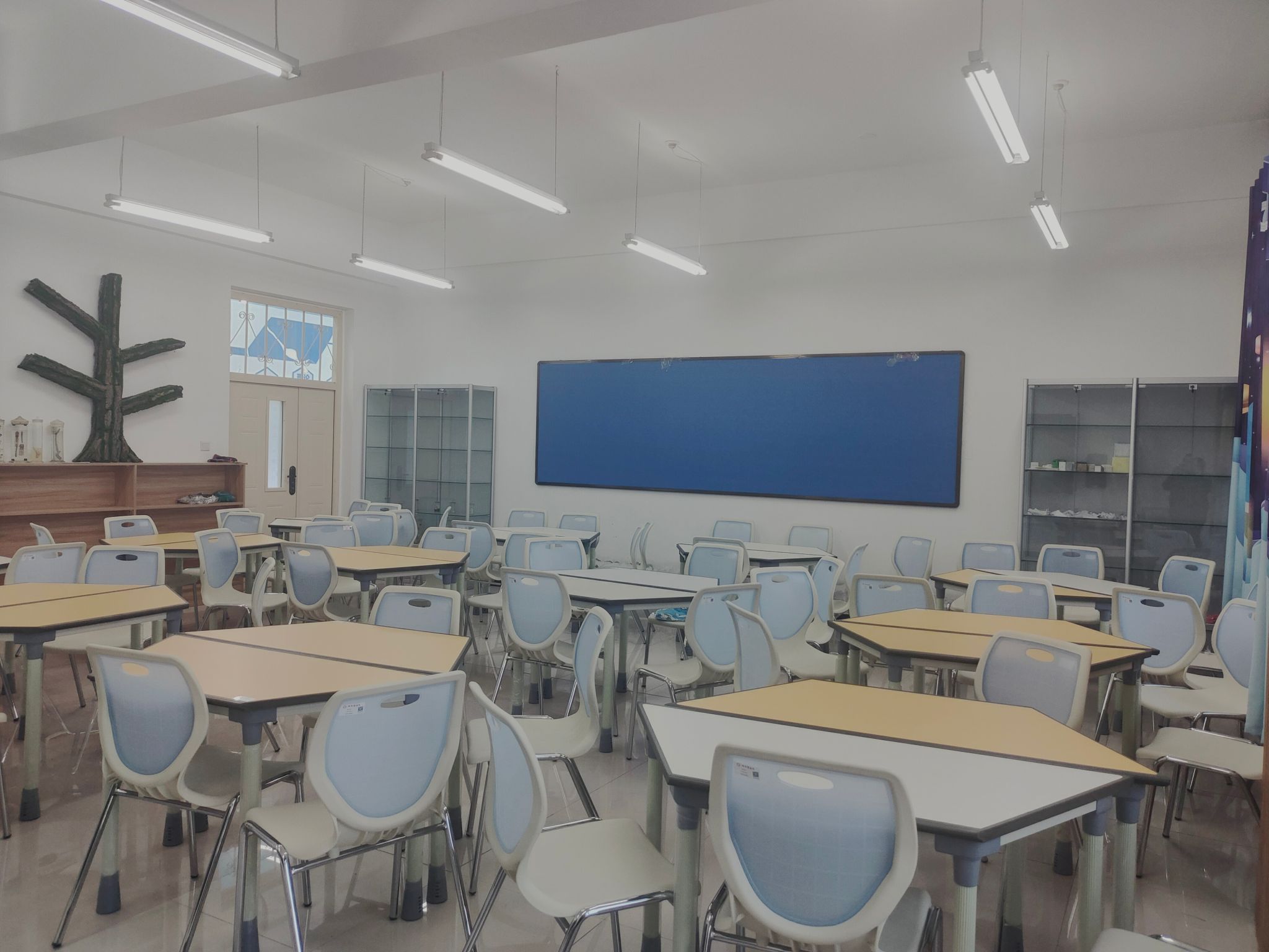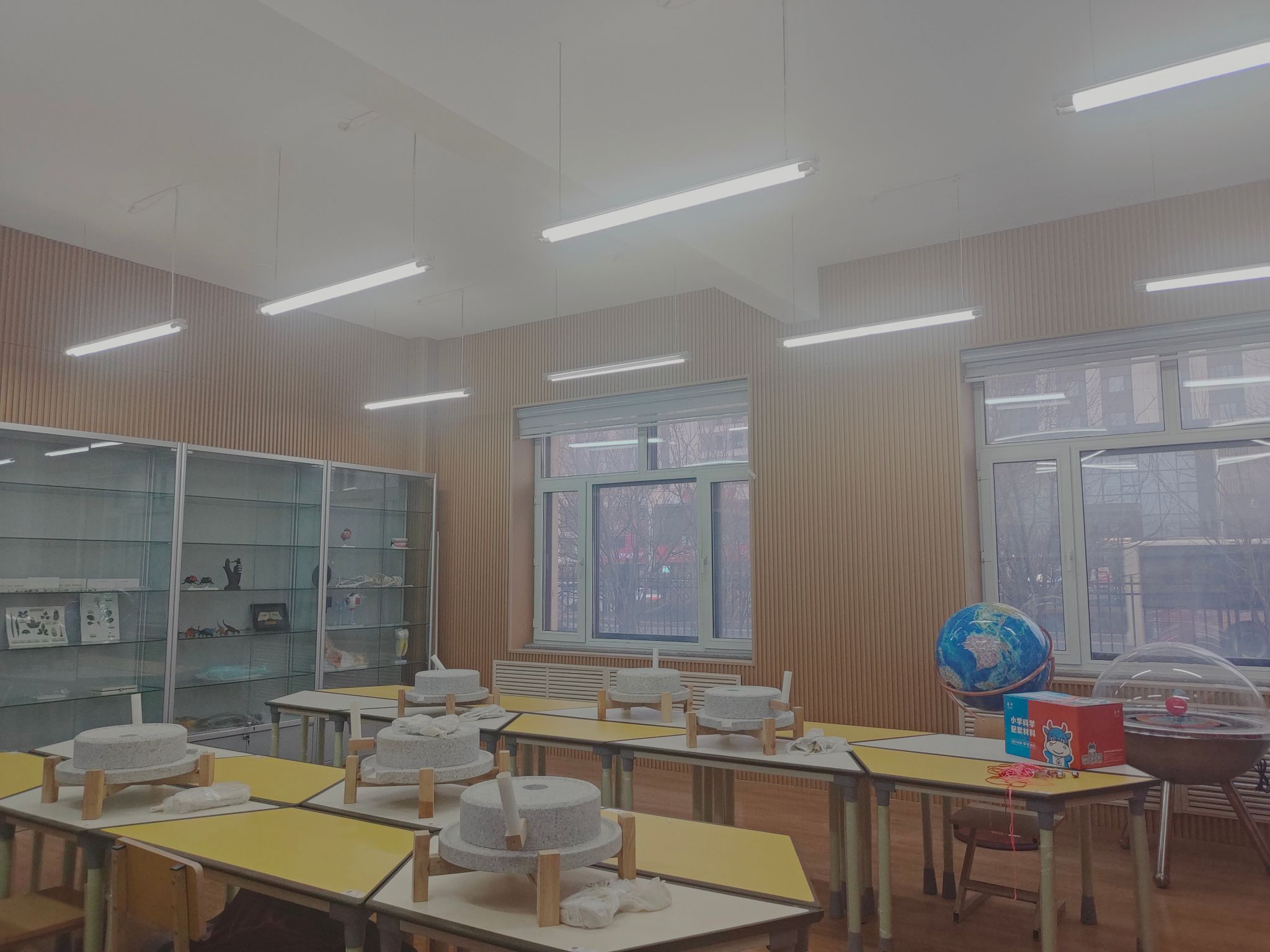 科学实验室位于主校区六号教学楼一楼,包括科学实验室(1)、科学实验室(2)以及科学实验室(3)。科学实验室(1)配备有科学实验与制作的教具及实验材料等,包括地球仪、小型石磨、人体模型、动植物标本等等,为学生提供科学实践所需材料及仪器;科学实验室(2)和科学实验室(3)配备有教学设备,包括一体机、学生桌椅、玻璃展示柜等,方便教师进行示范教学和学生进行实践操作,是学生进行科学实验与制作的主要场所。此外,教室还设有专门的清洁工具,确保教学环境的整洁与有序。