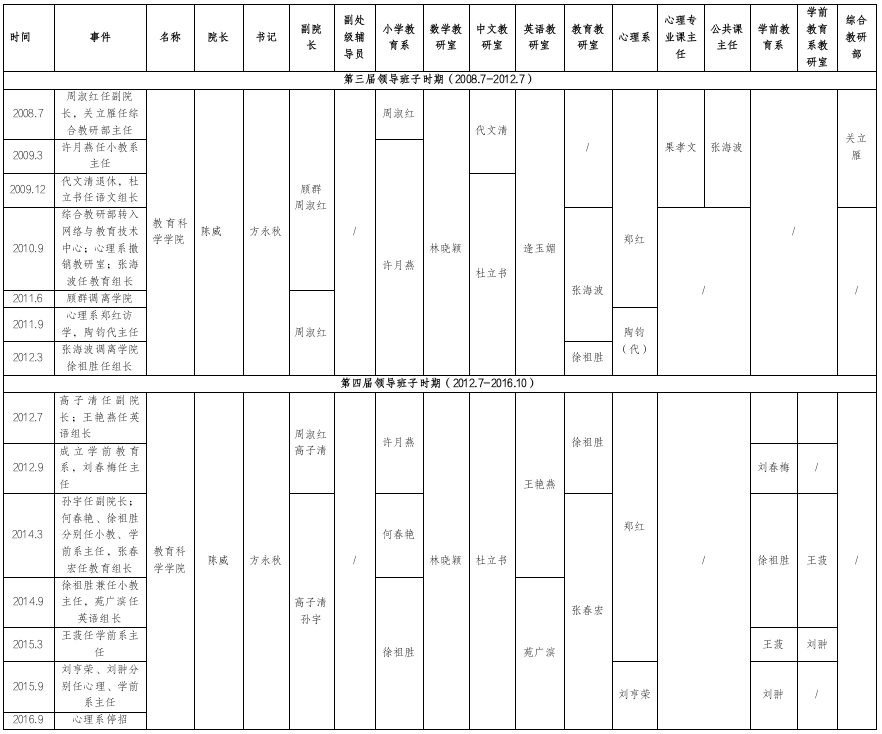 2008 年 7 月,在第三届中层领导班子换届改选中,陈威担任院长,方永秋担任副书记兼副院长、顾群担任科研副院长、周淑红担任教学副院长。周淑红(2008.7-2009.3 兼任)、许月燕(2009.3-)担任小学教育系主任,郑红担任心理学系主任,关立雁担任综合教研部主任。