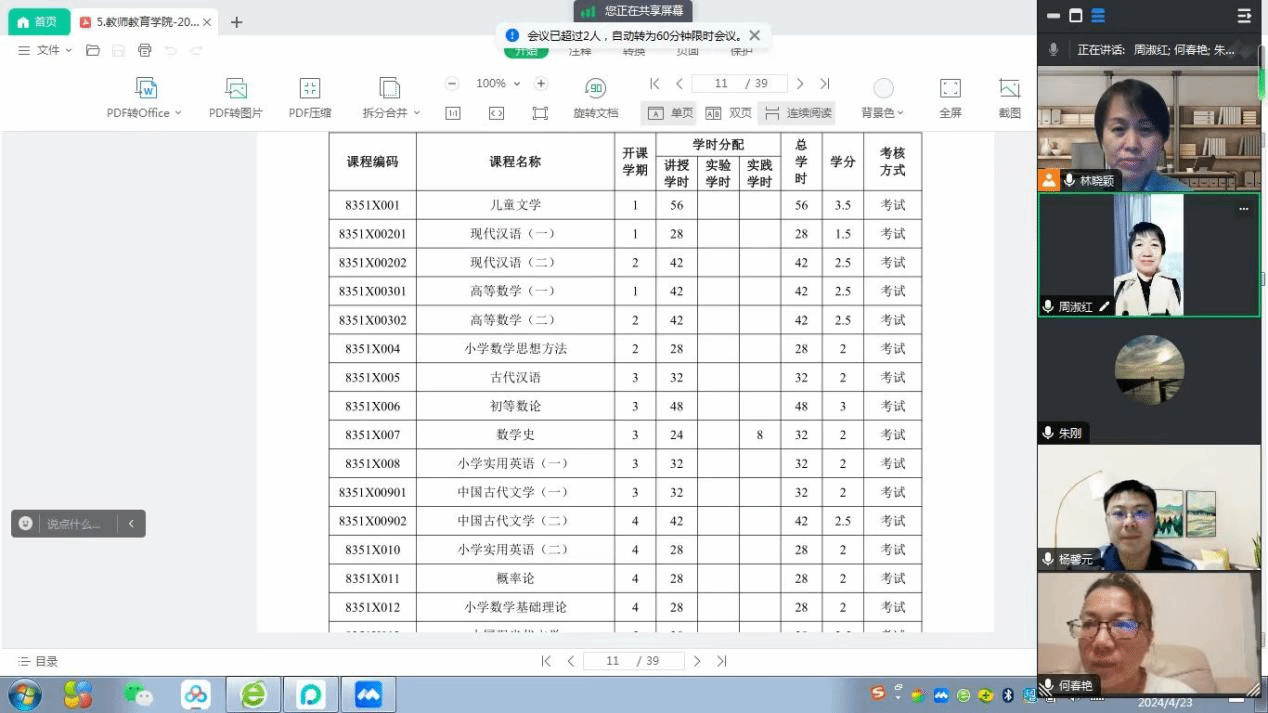(文/汪洋)4月23日至25日,我院小学教育专业和学前教育专业的各教研室组织召开2024版人才培养方案研讨会,会议分别由学前教研室主任刘泽旭、心理教研室主任嵩钰佳、教育教研室主任孙学玉、数学教研室主任林晓颖、中文教研室主任吴泓主持,各教研室教师参会。