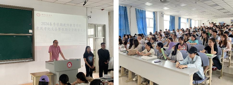 为端正考试风气、严肃考试纪律,进一步加强诚信学风建设, 营造一个公正有序的考试环境。教师教育学院于6月20日在6501教室召开考风考纪大会暨假期教育安全大会。本次大会由副处级辅导员老师孙华主持,22级学生辅导员老师李博宇和21级学生辅导员老师董佳欣出席,21、22、23级全体学生参加。
