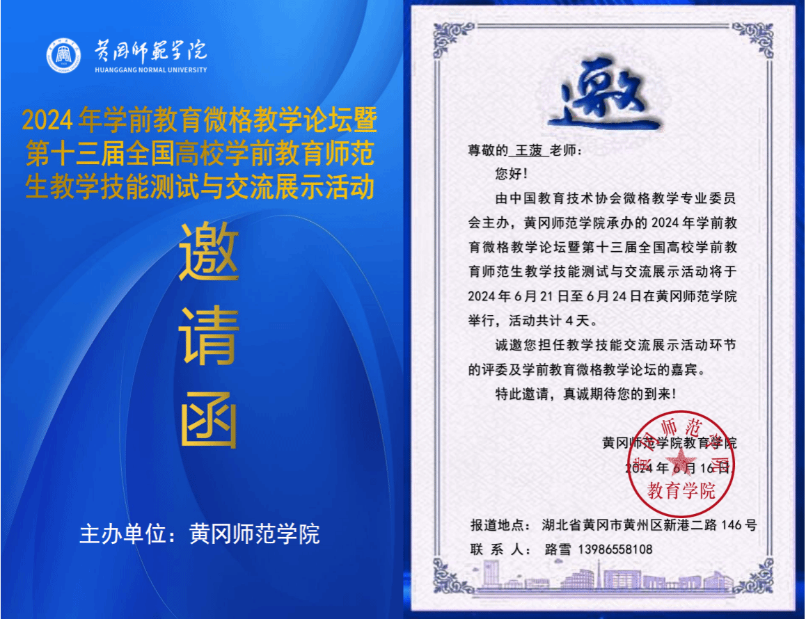 (文/王菠)6月21日至24日,由中国教育技术协会微格教学专业委员会主办,黄冈师范学院承办的2024年学前教育微格教学论坛暨第十三届“华文”高校学前教育师范生教学技能测试与交流展示活动落下帷幕。教师教育学院学前教育专业6名学生参赛,马雨馨荣获二等奖,姚秭宁、张玮楠、文印、杨蕊荣获三等奖,刘灿荣获优秀奖。教师王菠、刘泽旭、刘翀、孙丽影、温晓静、邢曌获优秀指导教师奖。学前教育专业王菠老师受邀担任教学技能交流展示活动环节的评委及学前教育微格教学论坛的嘉宾。