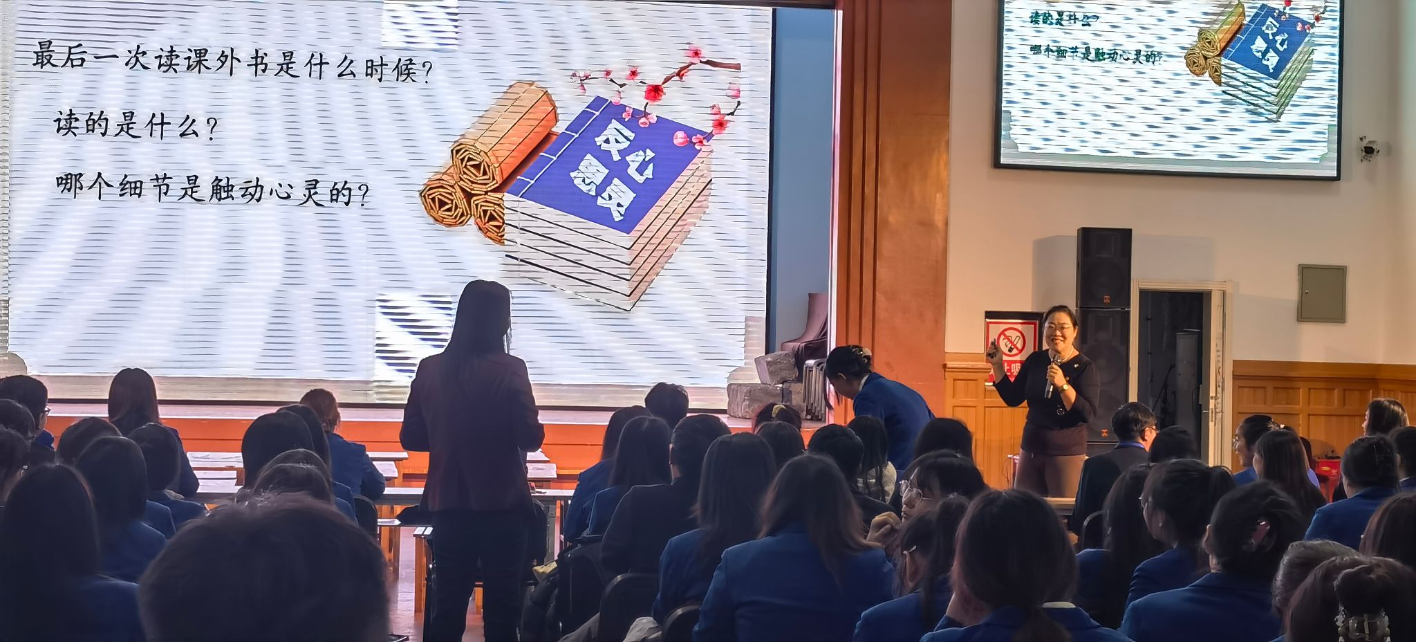 接下来,在王欢主任主持下,师范生们兴趣盎然地欣赏了四年三班同学饱含深情演绎的红色课本剧《英雄》和五年级部分同学表演的诗文诵读《大唐》,观摩了付裕老师生动活泼的精品课《精卫填海》、学习了盛茜老师数学团队分享的研课成果《解读核心素养表现 阅读理解教材本真》,并聆听了黄海容老师精心准备的介绍阅读方法的专题讲座《整本书阅读的思考与实践》。礼堂里的师范生不时用热烈的掌声表达对台上师生的认同,他们不停地拿出手机拍下一个个不想忘记的画面,高高举手积极与台上的老师互动,不同学科的教研活动让师范生开阔了眼界、增长了知识。