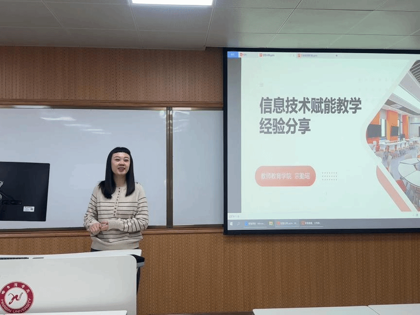 会议第二阶段,学前教育专业教师宗勤瑶以《信息技术赋能教学经验分享》为题展开讲解。宗勤瑶作为我院信息技术赋能教学改革探索的代表,其课程教学案例先后被推荐为校级和省级战“疫”课堂优秀案例,案例分享被我校教学发展中心纳入新教师培训资源库,并荣获2024年春期中教学示范课一等奖。分享过程中,宗老师就如何借助学习通快速、精准地分析学生的学习情况,掌握学生的学习进度和知识掌握程度,开展个性化教学进行了充分展示;就教学过程中经常遇到的课件展示与学习通平台的切换与分屏、教师个人设备与教室教学设备连接与共享、教室网络波动应急情况处理等问题进行了个人经验的介绍和演示。此后进入自由交流环节,参会教师们踊跃发言,就信息技术应用过程中遇到的问题,如技术操作难题、教学资源整合等展开深入探讨。大家各抒己见,分享解决方法和心得体会,现场思维碰撞出智慧的火花。
