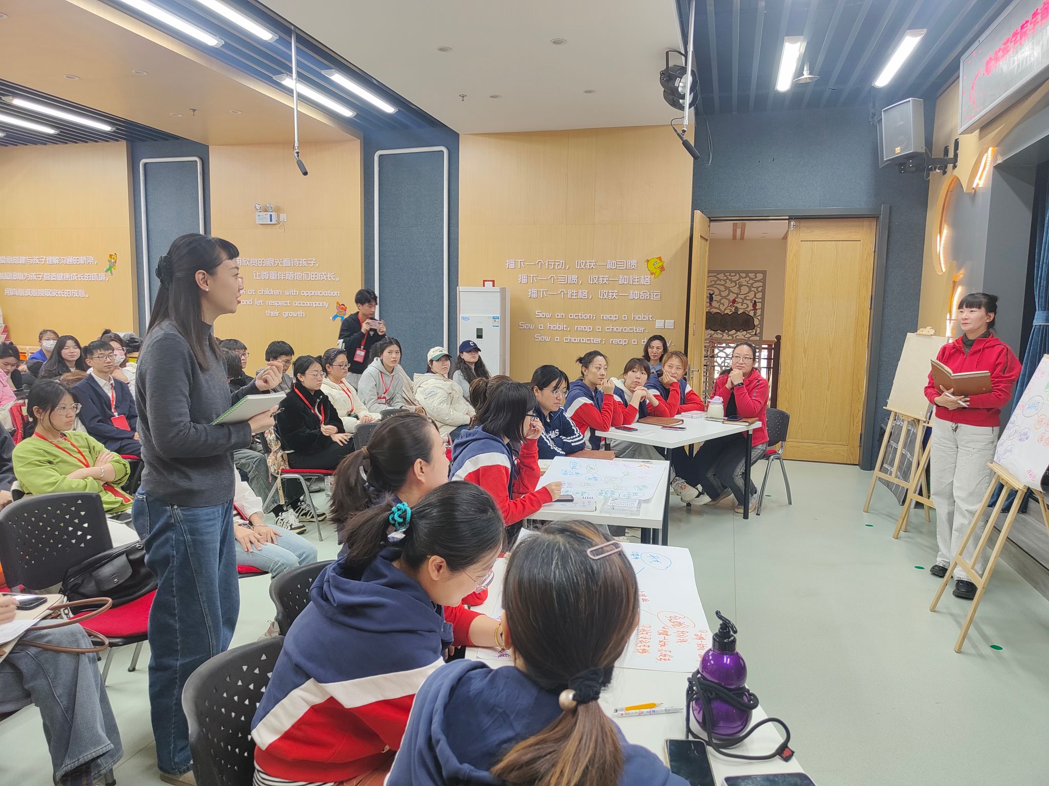 为了解如何在游戏后组织与实施“分享与交流”的环节,同学们观看了红霞幼儿园“名师工作室”团队教师的教研活动。教研过程中,老师们聚焦真问题、探索新思路、找寻多办法,围绕形式、经验、提示建议等维度进行了激烈的探讨,让同学们在游戏后的分享环节中能够更好地支持和促进幼儿的发展。