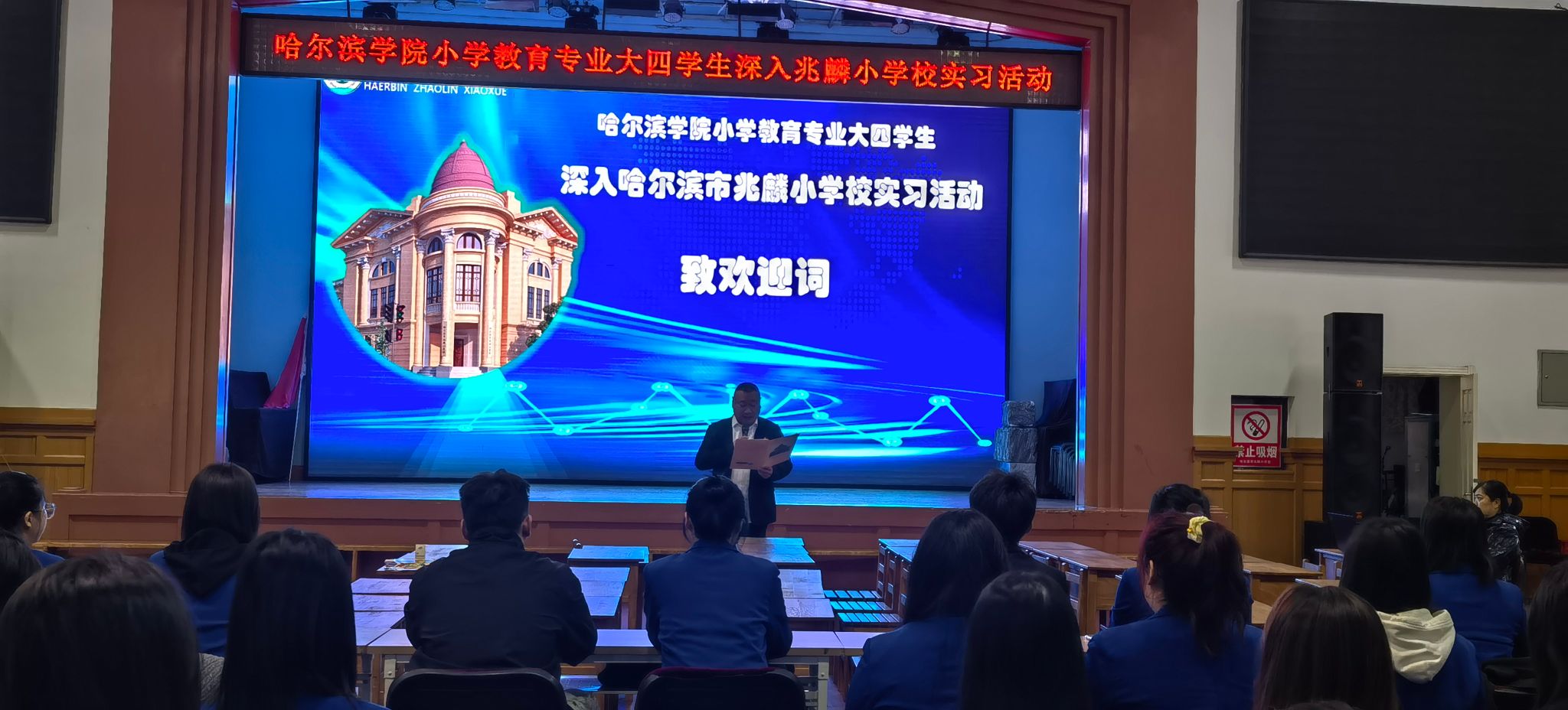 兆麟小学在礼堂举办了隆重的启动仪式,杨威书记、卞晔副校长和王欢主任参加了欢迎仪式。杨威书记热情地致欢迎辞,并简要介绍了哈尔滨市兆麟小学校的校史,让师范生感受到了学校深厚的红色文化底蕴,并激发了他们想深入了解李尚志烈士的愿望。