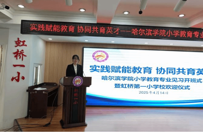 随后,见习学生代表王琦悦发言,表达了对见习机会的珍惜及投身教育实践的决心。哈尔滨学院带队教师徐祎冉老师讲话,希望大家在实践中践行教育理念,将理论与实践深度融合,积累宝贵经验。