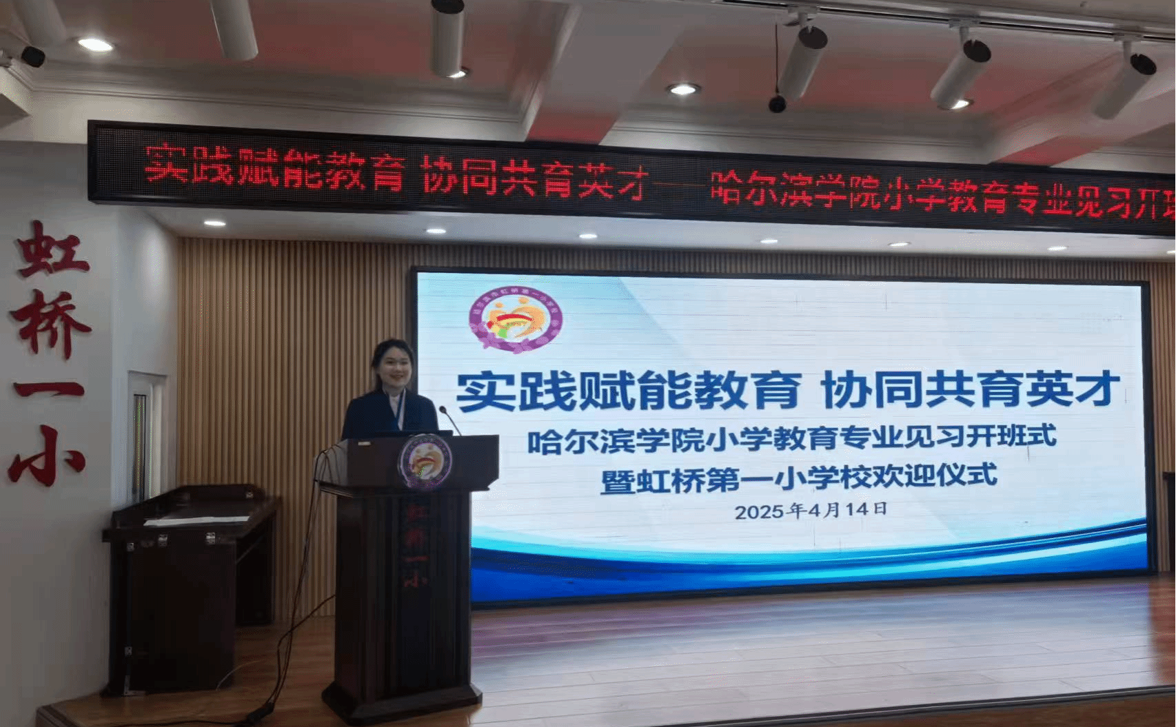 (文/徐祎冉)4月14日上午,我院23级小学教育专业16名同学由徐祎冉老师带队,前往哈尔滨市虹桥第一小学校,进行为期两周的教育见习活动,虹桥第一小学为我校学生举行了隆重的欢迎仪式。虹桥第一小学校长王铮、哈尔滨学院带队教师徐祎冉、虹桥第一小学指导教师、哈尔滨学院见习学生出席,欢迎会由虹桥第一小学教学主任王润崧主持。