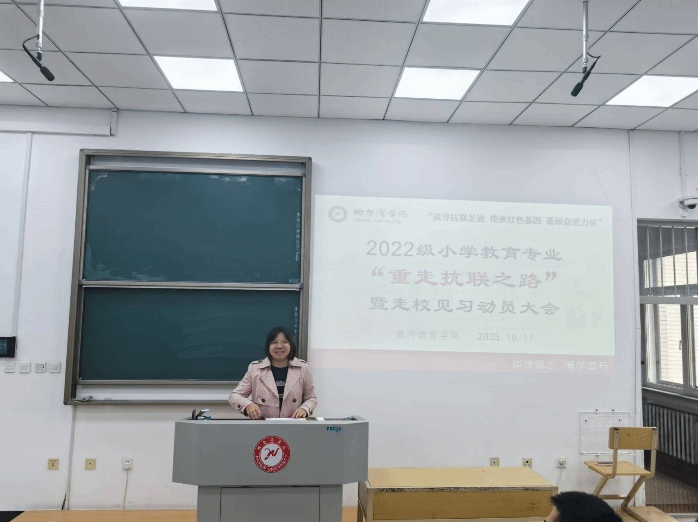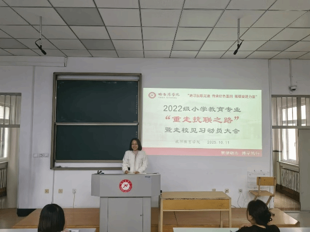 (文/孙学玉、郭彦玺)为落实我校东北抗联精神建设红色文化育人体系工作,将红色文化育人与教育实践相结合,我院于10月11日下午1:30在6401召开2022级小学教育专业“重走抗联之路”暨走校见习动员大会。教师教育学院院长刘亨荣教授、走校见习带队教师、技能考核教师以及22级小学教育专业全体学生出席本次大会,会议由小学教育专业系主任孙学玉主持。