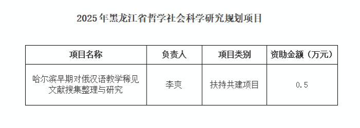 (文/侯捷)2025年黑龙江省哲学社会科学研究规划项目评选结果已经揭晓。我院教师李爽获批扶持共建项目。该项目的获批不仅为学院相关学科的建设与发展注入了新的活力,也极大地鼓舞我院更多教师,特别是青年学者,积极投身科研工作,勇于申报各类高级别项目,从而在全院范围内进一步营造“重科研、强学术”的浓厚氛围。