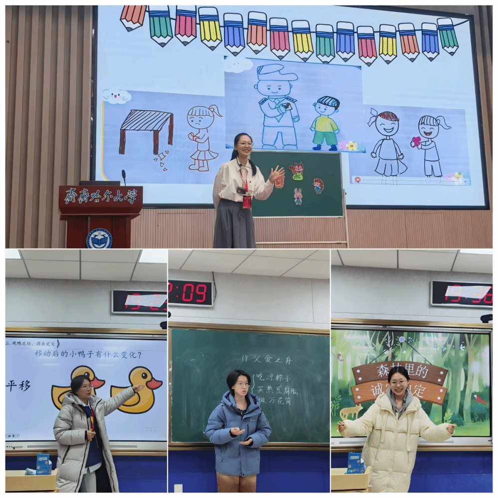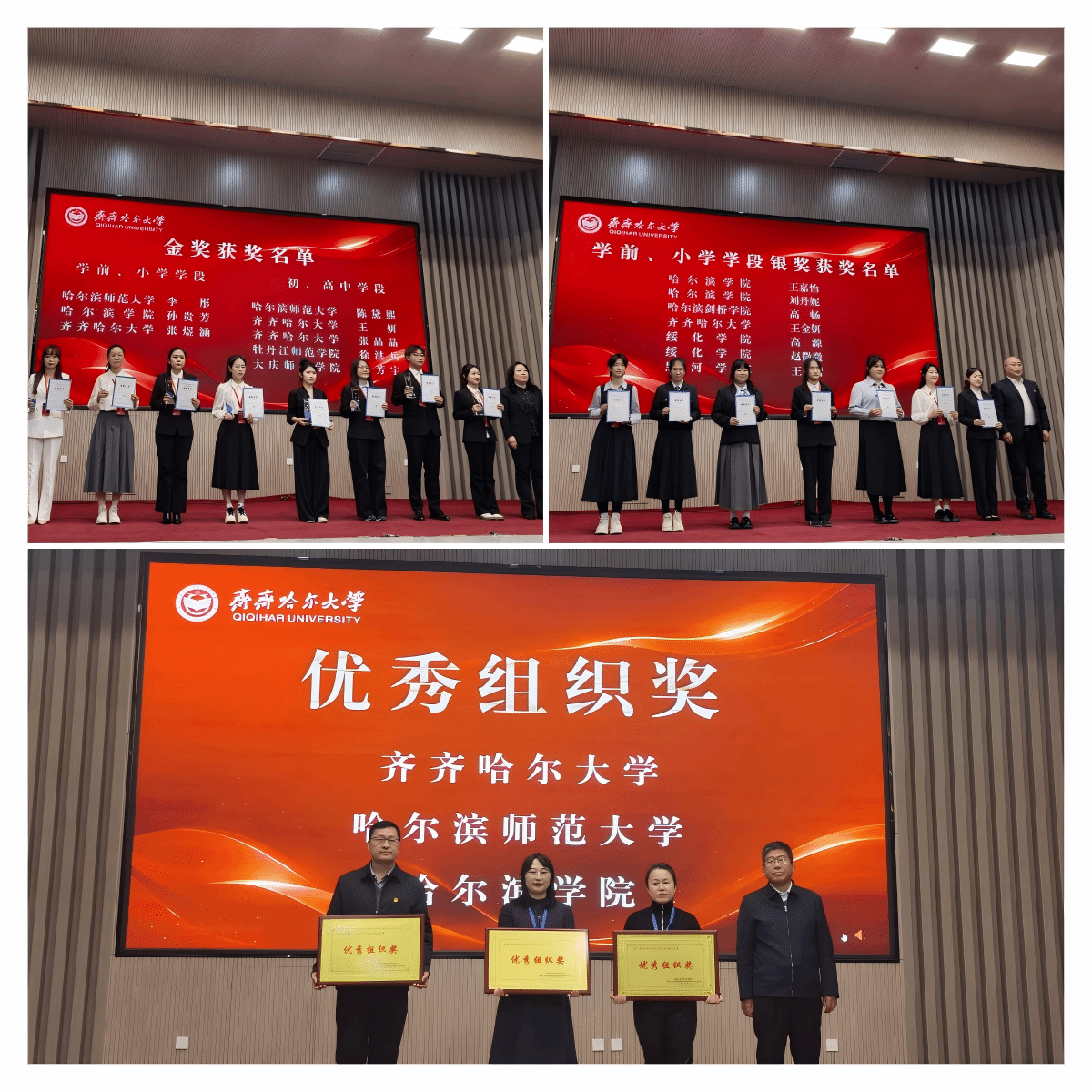 (文/刘翀)2025年11月14日至16日,由黑龙江省教育厅主办的首届高校师范类专业学生教师技能大赛在齐齐哈尔大学隆重举行。本次大赛以“以赛促学、以赛促教、以赛促研”为宗旨,汇聚了来自全省13所师范院校的78名选手同台竞技。经过激烈角逐,我院选派的三名学子凭借扎实的功底和出色的表现脱颖而出,斩获佳绩:2023级学前教育专业孙贵芳同学荣获金奖(第一名),2022级小学教育专业王嘉怡、刘丹妮两位同学双双摘得银奖。指导教师林晓颖、刘翀、汪洋亦凭借出色的指导工作,荣获“优秀指导教师”称号,我校获得优秀组织奖。在颁奖仪式上,孙贵芳同学受邀对本次获奖教学活动进行了现场展演。