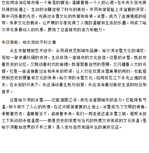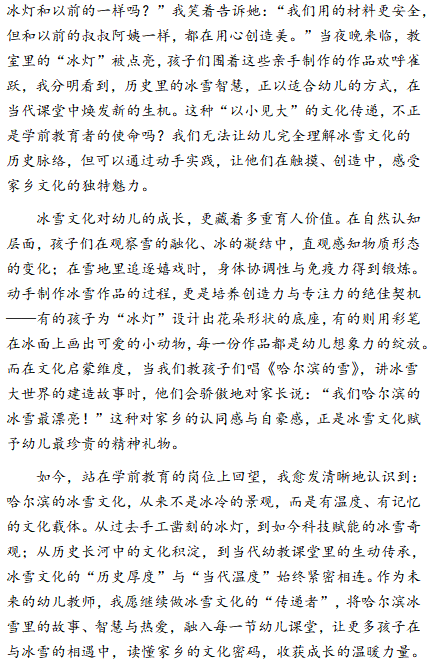 本次征文活动成功营造了校园内浓厚的冰雪文化氛围,成为同学们感知哈尔滨冰雪文化的重要窗口。通过此次征文比赛,更多同学了解到哈尔滨冰雪文化不仅有 “冰奇灯巧、玉砌银镶” 的视觉盛宴,更有 “顶天立地,铸我冰魂” 的精神内核。同学们用青春语言传播冰雪故事,让冰雪文化中的历史厚度和当代温度,穿透岁月的尘埃,在如今的哈尔滨学院里绽放出 “续写” 的光芒。