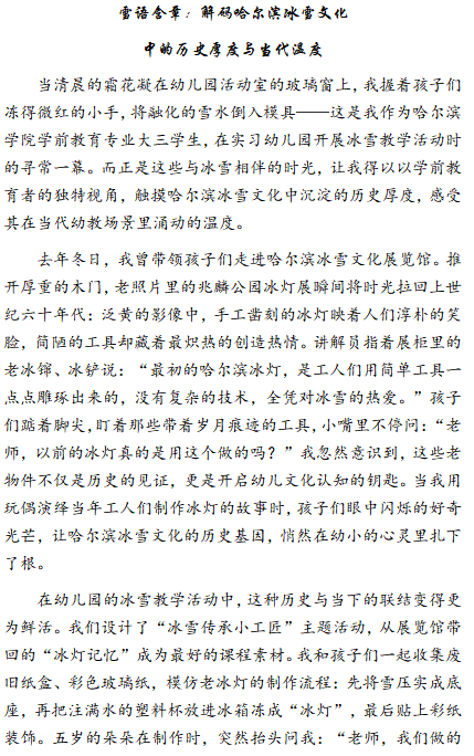 (文/李博宇)为深入贯彻习近平总书记关于冰雪经济、冰雪运动的重要论述,践行“冰天雪地也是金山银山”发展理念,哈尔滨学院教师教育学院精心打造特色冰雪文化育人载体,成功举办‘冰雪奇缘 感知自然’冰雪文化感知主题教育活动。其中,“雪语含章:解码哈尔滨冰雪文化中的历史厚度与当代温度”征文比赛已圆满落幕。