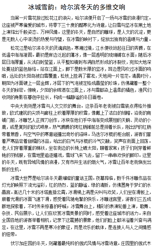 本次征文比赛自启动以来,得到全校各学院学生的积极响应,各学院学生踊跃投稿,作品围绕哈尔滨冰雪文化的历史传承、当代价值、城市记忆等多元主题展开,兼具思想深度与情感温度。经过学院领导、专业教师组成的评审团严格初审、评审及综合评定,最终评选出一等奖 1 名、二等奖2名、三等奖 3 名及优秀奖14名,他们的获奖等次及作品为:
