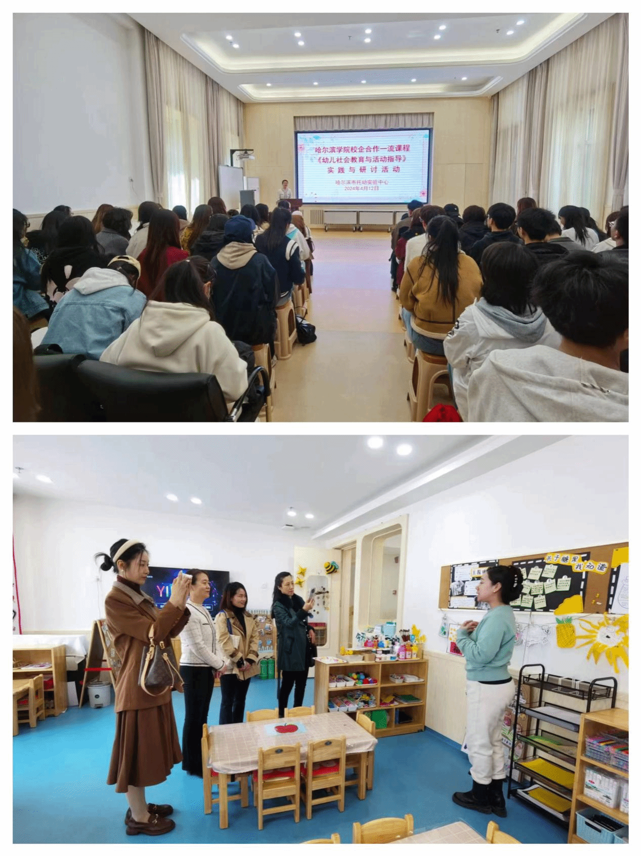 (文/王菠)4月12日上午,我院校企合作一流课程《幼儿社会教育与活动指导》走进哈尔滨市托幼实验中心进行现场教学与研讨,开展校企合作课程共建活动,学前教育系主任及课程负责人王菠带领团队教师和学前教育2021级学生参加此次活动,该活动是我院深入贯彻《关于深化本科教育教学改革全面提高人才培养质量的意见》文件精神所开展的系列活动之一,也是我院学前教育专业携手幼儿园强化师范生教育实践能力、构建协同育人模式的新探索。