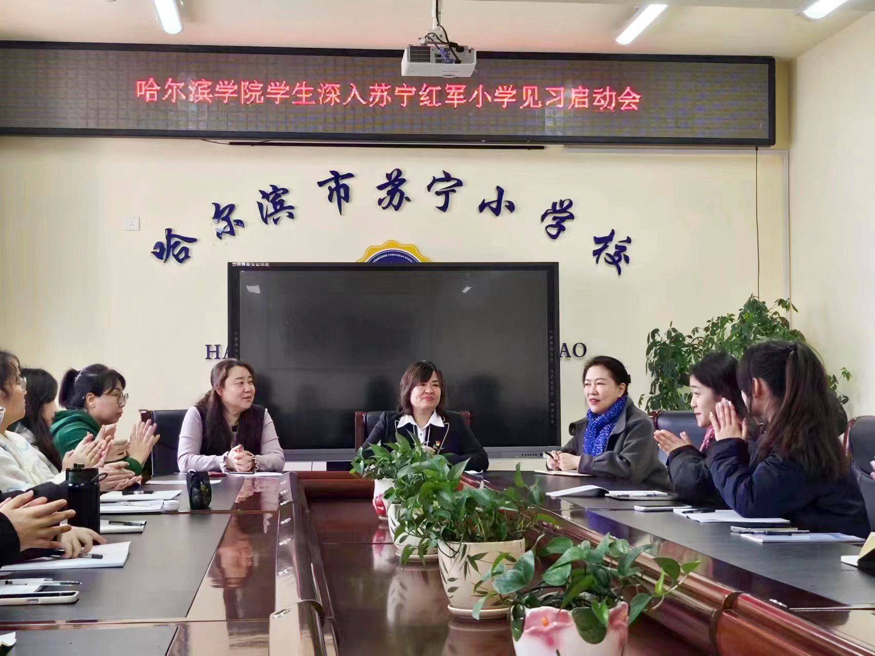 3月18日,小学教育专业2023级1班的16名师范生在秦平老师的带领下,来到哈尔滨市苏宁红军小学开展为期两周的见习。苏宁红军小学的姜肇玉校长、吴岩主任等对哈尔滨学院师生的到来表示了热烈欢迎,在三楼会议室召开了见习启动会。