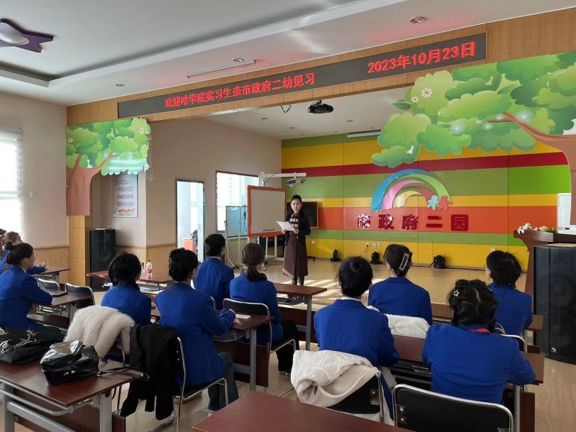 2023年10月23日,伴随着秋日朝阳,哈尔滨学院教师教育学院学前教育系2021级16位同学,在孙丽影老师的带领下,来到了哈尔滨市政府机关第二幼儿园,开始了为期两周的见习工作,市政二幼的刘媛媛园长和冯学平副园长热情的接待了见习师生。