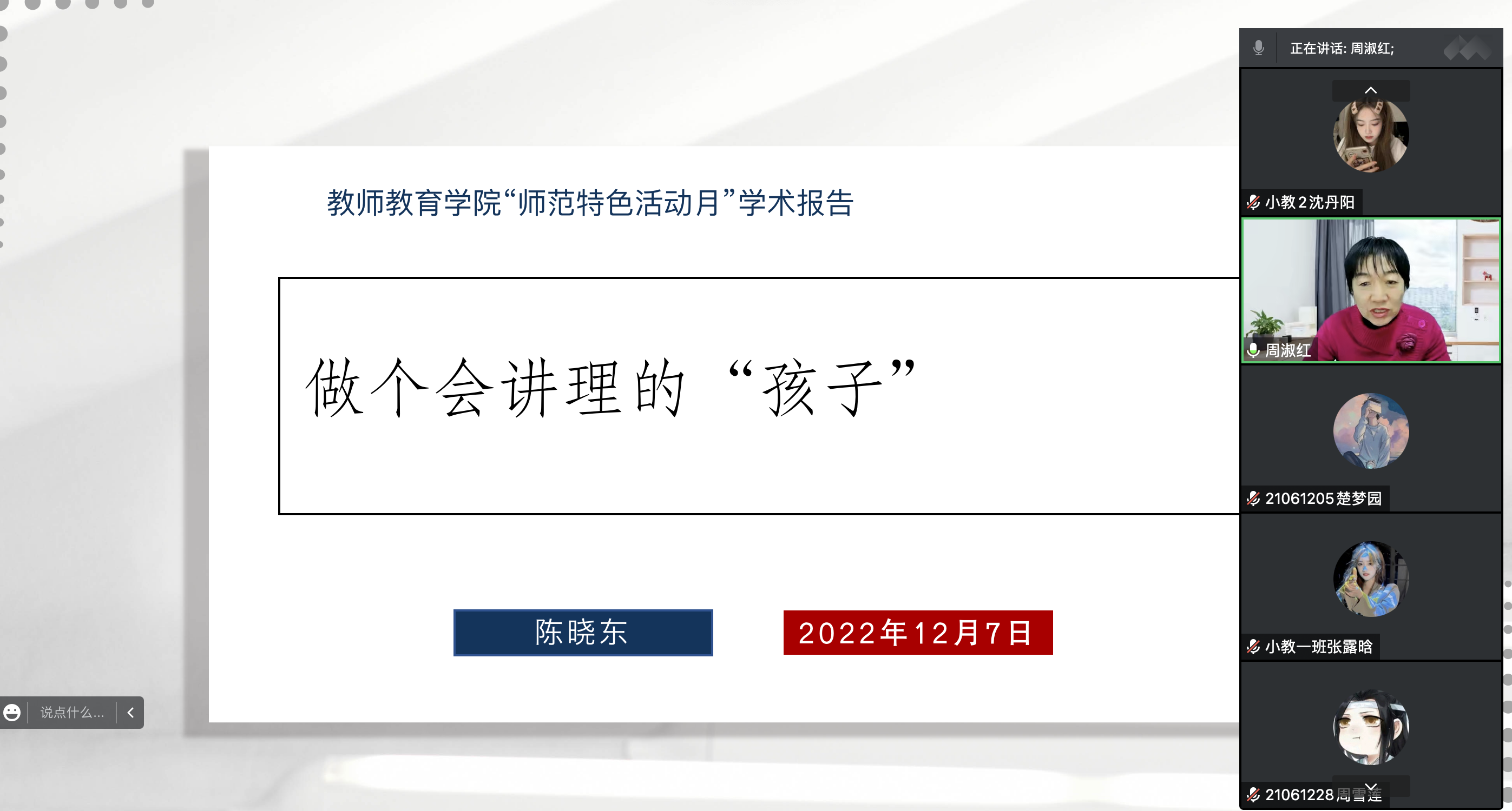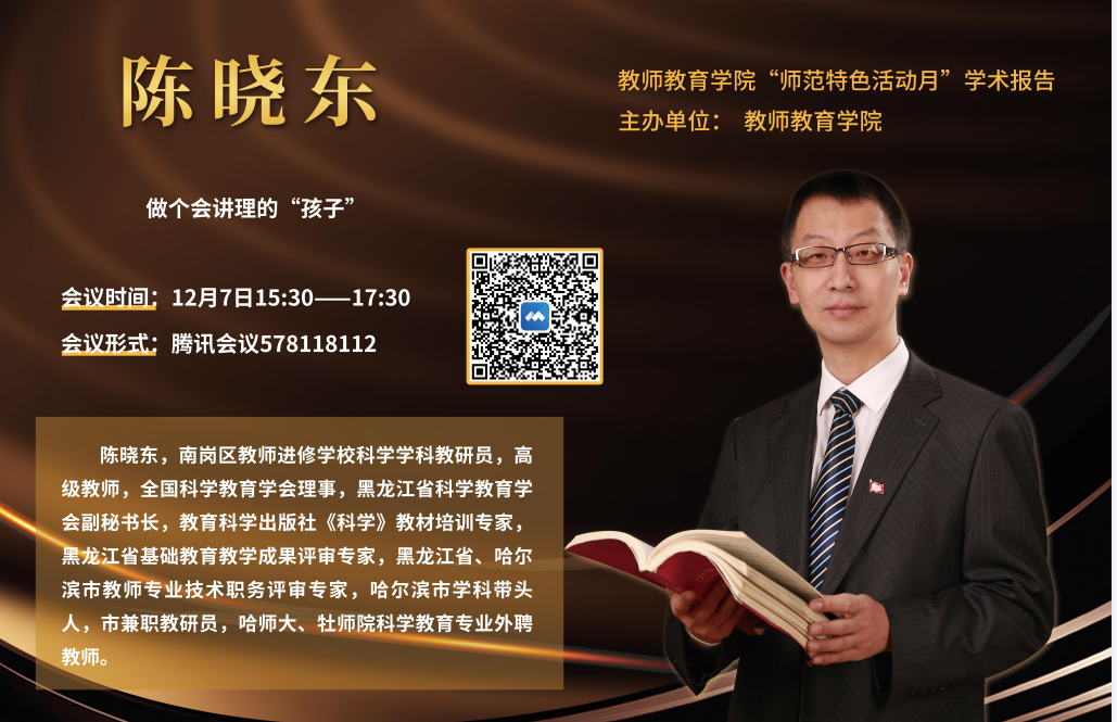 2022年12月7日,我院邀请优秀校友、南岗区教师进修学校科学学科教研员陈晓东老师为我院师生做名为“做个会讲理的‘孩子’”的主题报告,全院师生在线收听本次报告。本次讲座由小学教育系主任王睿主持,教师教育学院院长周淑红教授致欢迎辞,指出本次讲座的重要意义与陈晓东老师介绍的小学科学教育发展路径对我院师生专业发展的重要意义。