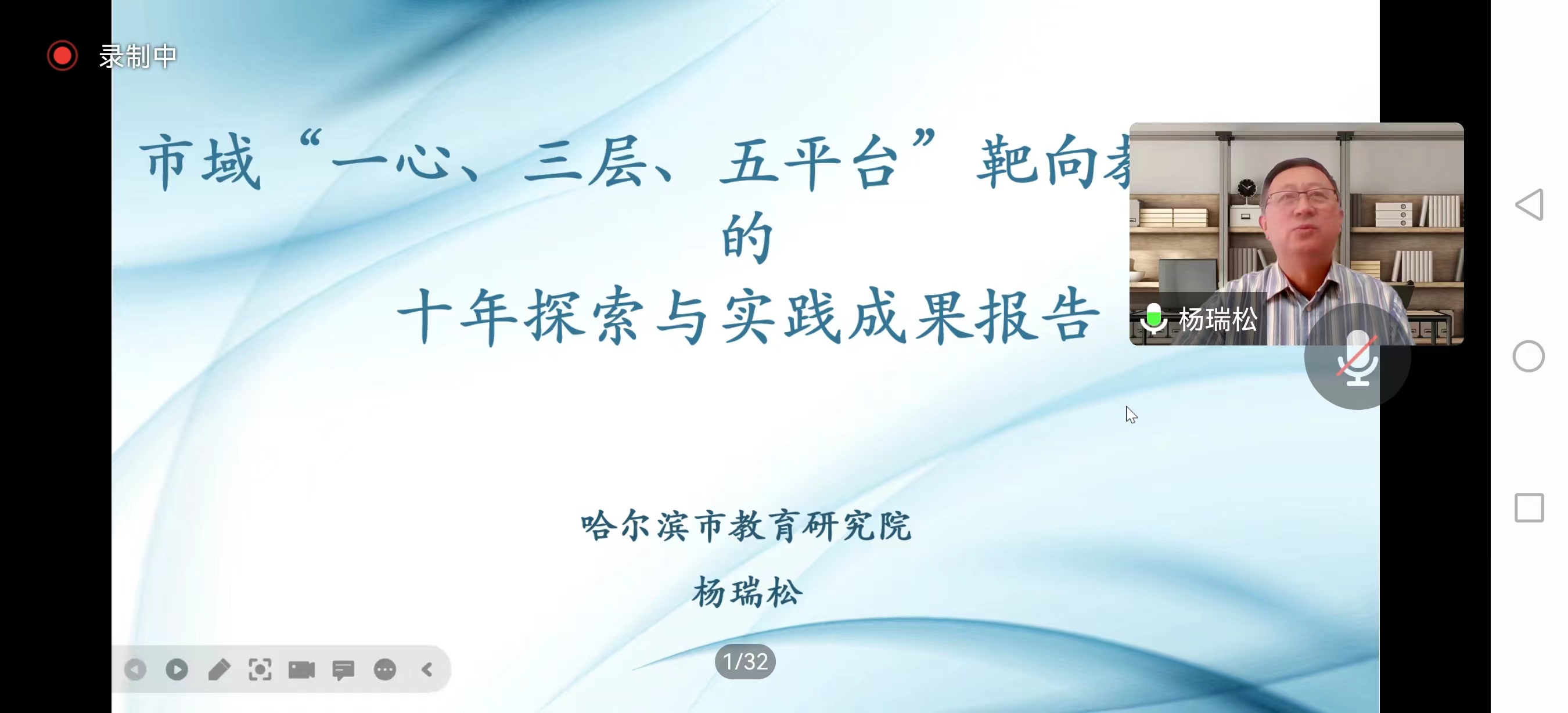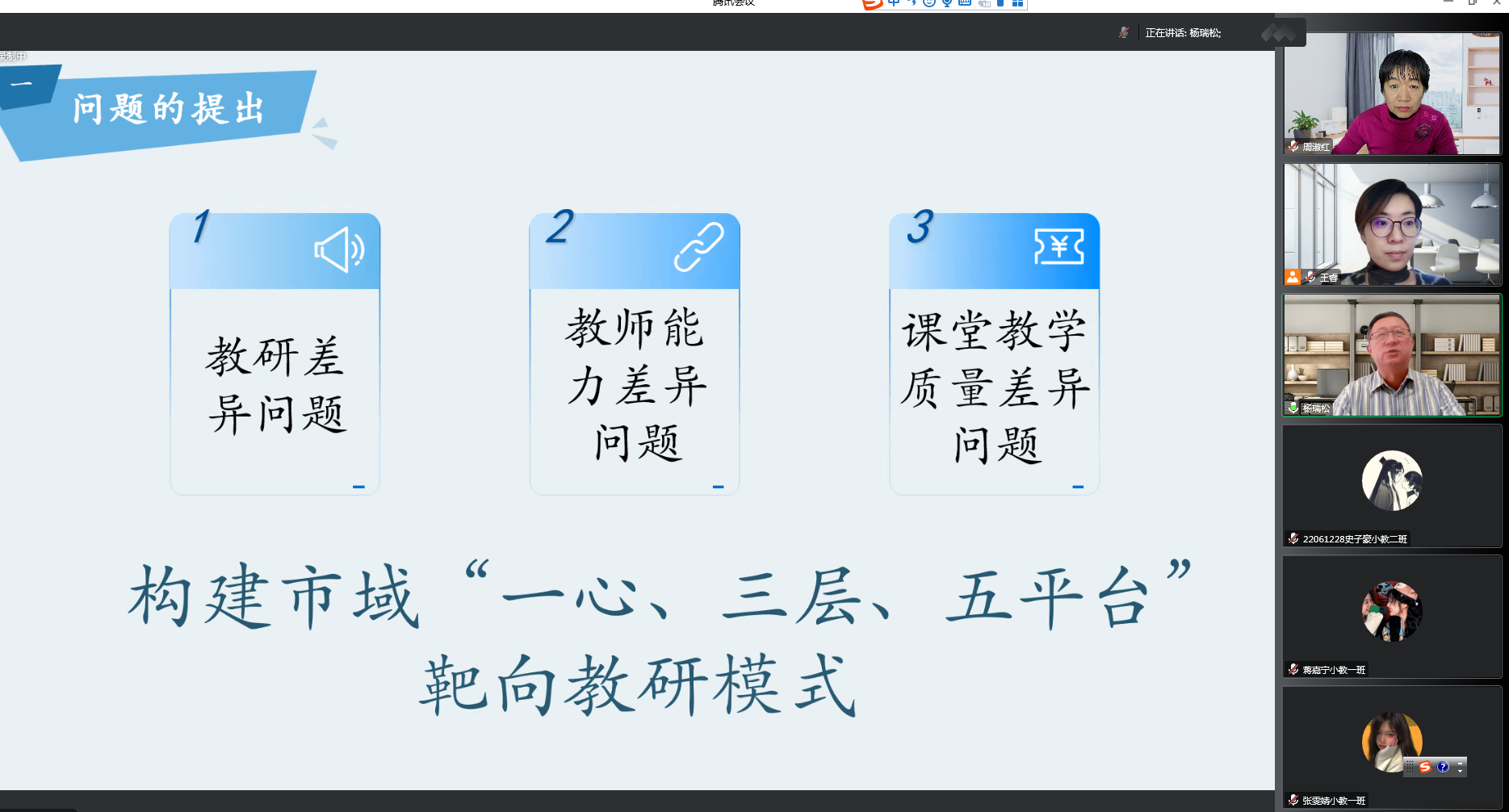 本次讲座主要围绕“‘一心三层五平台’靶向教研模式”展开,即以“聚焦问题精准施策,课堂提质师生发展”为核心,市区校三级联动,教学展示、基地教研、团队教研、网络教研、主题教研五平台协同互动的教研模式,破解城乡教师能力、课堂教学质量、教学资源差异等问题,推动教学改革形成“四位一体”育人课堂新样态,提升全市的教育教学高质量发展。杨瑞松老师介绍了“一心三层五平台”靶向教研模式的实施策略:提供课堂教学展示平台,优化教学研究;夯实基地建设引领平台,推进典型引路;搭设网络教研共享平台,放大教研功效;建设教师团队研修平台,助推教师专业成长;创设主题教研交流平台,实现教研精准实施。“一心三层五平台”靶向教研模式的主要成效包括:形成了“一心、三层、五平台”靶向教研模式,推动了本土化教研工作理论研究与实践;构建“四位一体”育人课堂教学理论,丰富了学科全程全方位育人经验;转变课堂教学方式,形成落实学生核心素养的实践研究成果;形成线上线下相融合的教研模式;通过三级联动五平台推进,实现教育教学教研均衡发展。