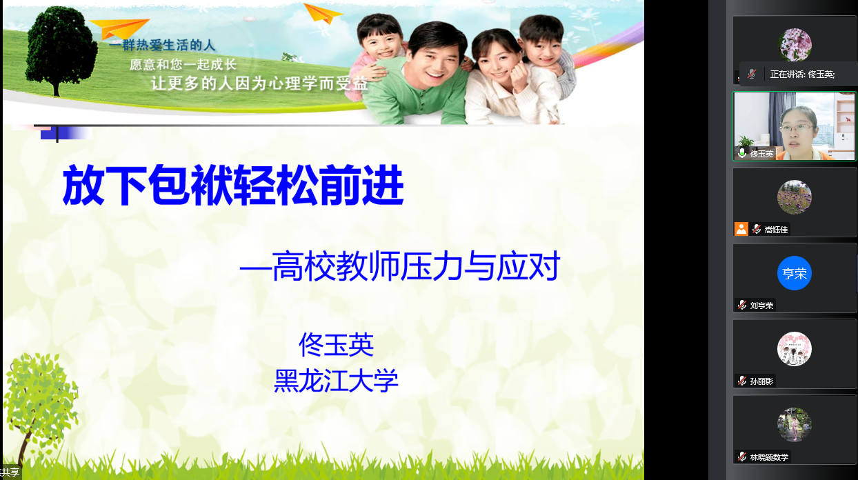 2022年11月30日下午,黑龙江大学教育学院、教育科学研究院副院长佟玉英副教授通过线上腾旭会议为我院全体教师做了一场题为《放下包袱轻松前进——高校教师压力与应对》的讲座。讲座由小学教育专业心理教研室主任嵩钰佳副教授主持。教师教育学院周淑红院长代表全院教师欢迎佟院长来我院讲座,表达了黑龙江大学及佟院长对我院工作给予支持的感谢。
