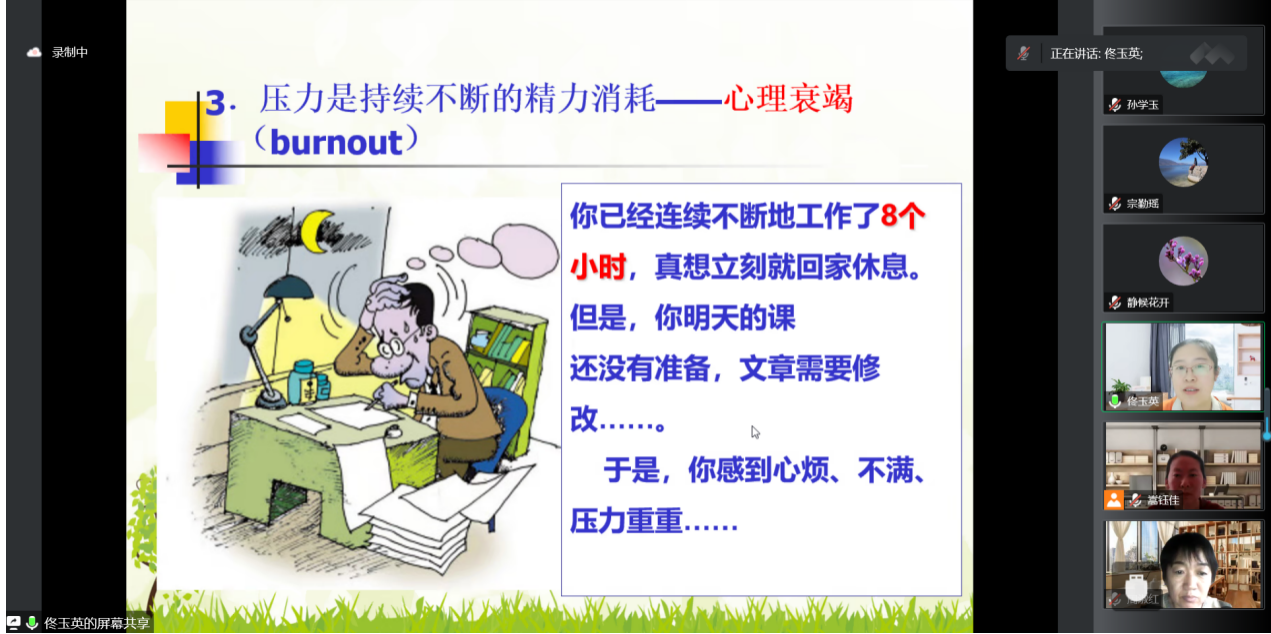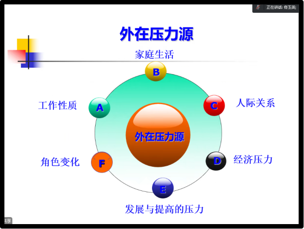 佟院长讲座围绕“压力是什么、高校教师压力现状、高校教师的压力源、压力的反应及意义,以及如何应对压力”等五个方面展开。讲座内容贴近高校教师心理压力健康现状,内容上兼具理论深度和具体实践指导性,为我院教师积极应对压力提供了有效的心理解决办法。讲座结束后,我院杨晓静书记再次表达了对佟院长本次讲座,以及一直以来对我院工作支持的感谢。