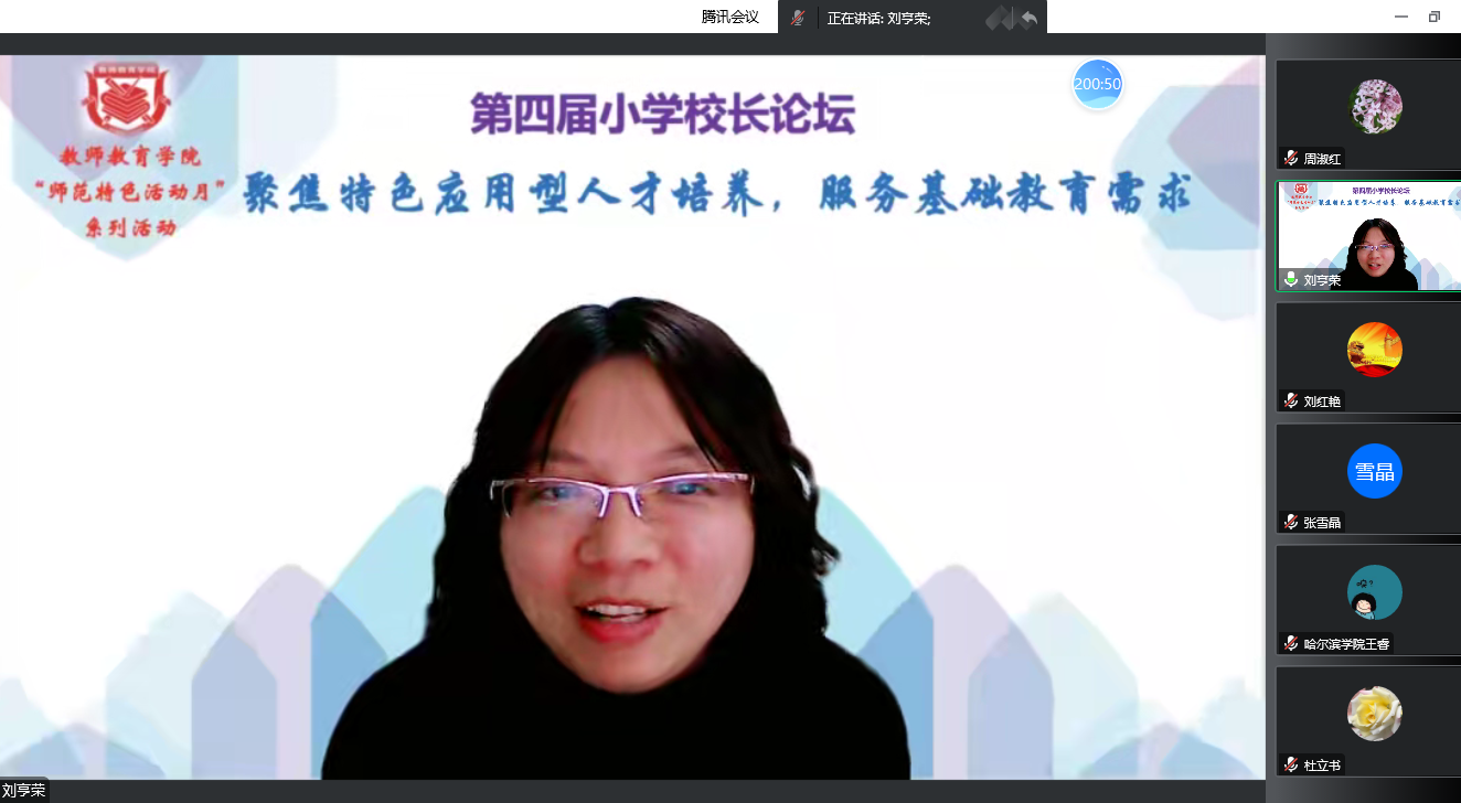校院共建论坛由刘亨荣主持,我院师生与各位校长就“小学生需要什么样的教师”“在职前阶段,未来小学教师坚定从教信仰的主要方法”“未来小学教师需要什么样的核心素养”展开讨论,校长们与师生们各抒己见,线上学术交流气氛热烈。