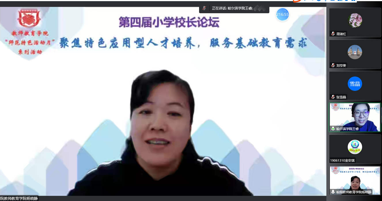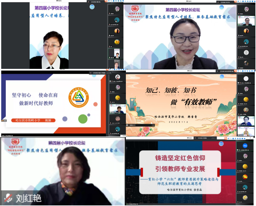 为提升小学教育专业人才培养质量,促进小学教育专业专业建设与发展,加强小学教育专业扎根龙江基础教育、服务龙江基础教育的产业服务能力,2022年11月25日,教师教育学院小学教育专业举办第四届小学校长论坛。本次小学校长论坛作为教师教育学院“师范 特色活动月”系列活动之一,以党的二十大报告中特别提出的“高质量教育体系”为思想引领,以“聚焦特色应用型人才培养,服务基础教育需求”为主题,邀请哈尔滨市花园小学校校长曹永鸣、哈尔滨市师范附属小学校校长李文玲、哈尔滨市铁岭小学校校长姚颖、哈尔滨市复华小学校校长韩吉青、哈尔滨市王岗镇中心小学校校长刘红艳、哈尔滨市育红小学校校长张雪晶等六位校长作为基础教育代表参与此次论坛。哈尔滨学院教务处姜艳丽处长、教师教育学院周淑红院长、杨晓静书记、刘亨荣副院长以及小学教育专业全体师生出席了本次论坛。