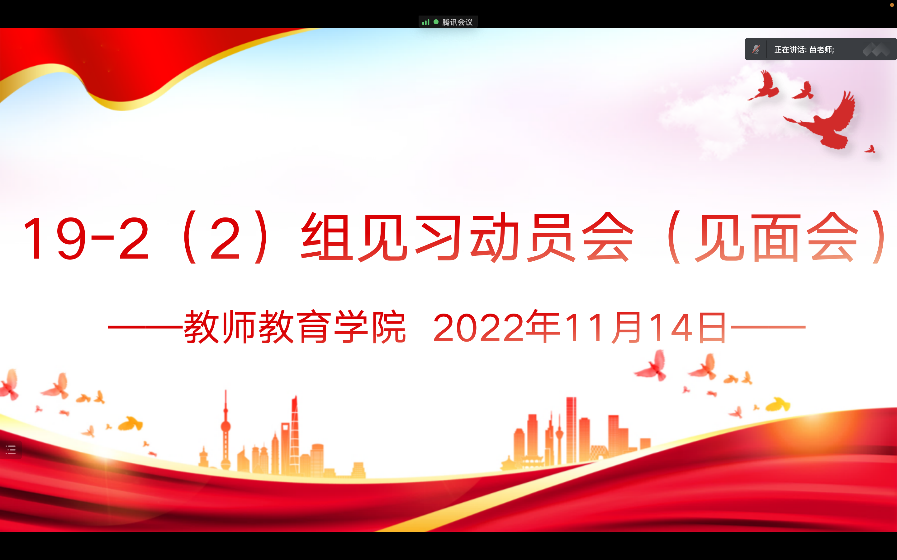 2022年11月14日17:30,于学院见习动员大会后召开了小组见习动员会,在见习动员会上,苗老师要求同学们要严格落实学院见习实施方案,其一,要认真对待此次教育见习活动,按要求完成见习任务与作业;其二,提醒同学们注重保证小学课堂安全,防止信息泄漏,积极协助小学教师工作,虚心学习;其三,按时参加小组研讨会、交流会。2022年11月15日,在线上召开了与苏宁小学见习启动仪式,参加会议的有苏宁小学曹雅楠副校长、苏宁小学吴岩主任、苏宁小学教师代表单老师、哈尔滨学院见习带队教师苗老师、19级小学教育专业2班16名见习生,会议由苏宁小学吴岩主任主持。