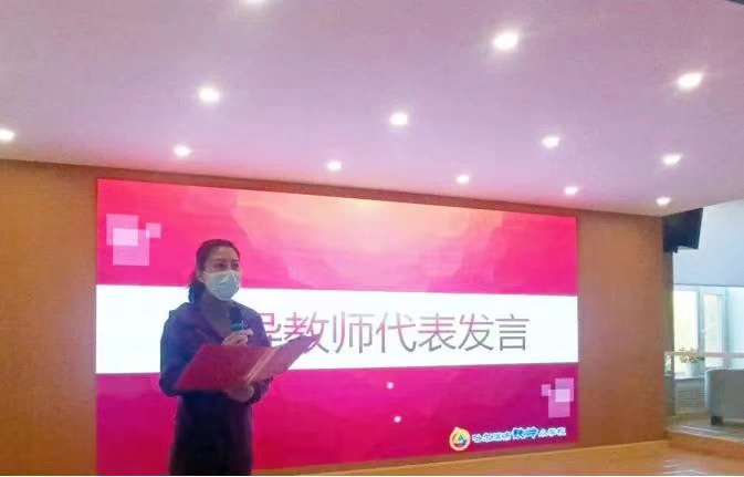指导教师代表在欢迎仪式上发言并祝愿大家能有所收获,在学习老教师丰富教学经验的基础上,根据自身条件创造性实施教育教学,不断进步、不断完善,逐步形成自己的教学思路、教学特色和教学风格,努力追求自身教学的高品位。